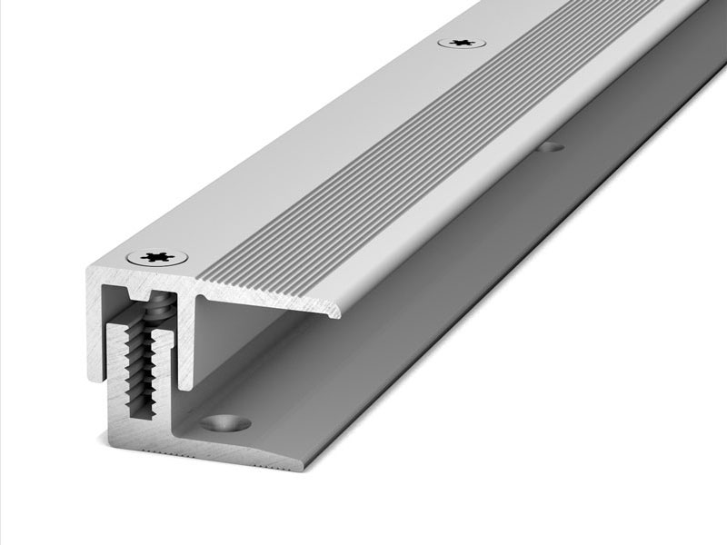 Die Montage erfolgt über ein Schraubprofilsystem: Zuerst wird das Basisprofil am Untergrund befestigt, anschließend wird das Oberprofil aufgesetzt und verschraubt. Die Profilstege greifen dabei sicher in den Schraubkanal. Bei Niveauunterschieden über 1mm kann alternativ ein anderes Profilsystem verwendet werden.