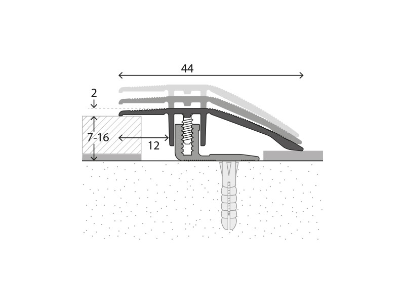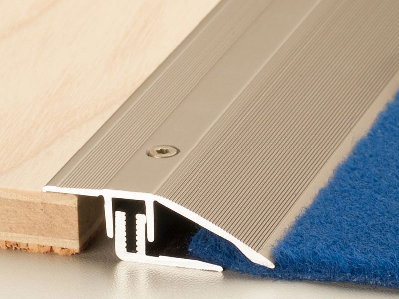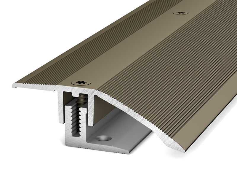 Die Montage erfolgt mit dem beiliegenden Schraubsystem. Zuerst wird das Basisprofil auf dem Untergrund verschraubt, anschließend der Bodenbelag verlegt. Danach wird das Oberprofil aufgelegt und im Schraubkanal fixiert. Für Übergänge mit größeren Dehnungsfugen sind Basisprofile mit breiterem Schraubschenkel erhältlich.