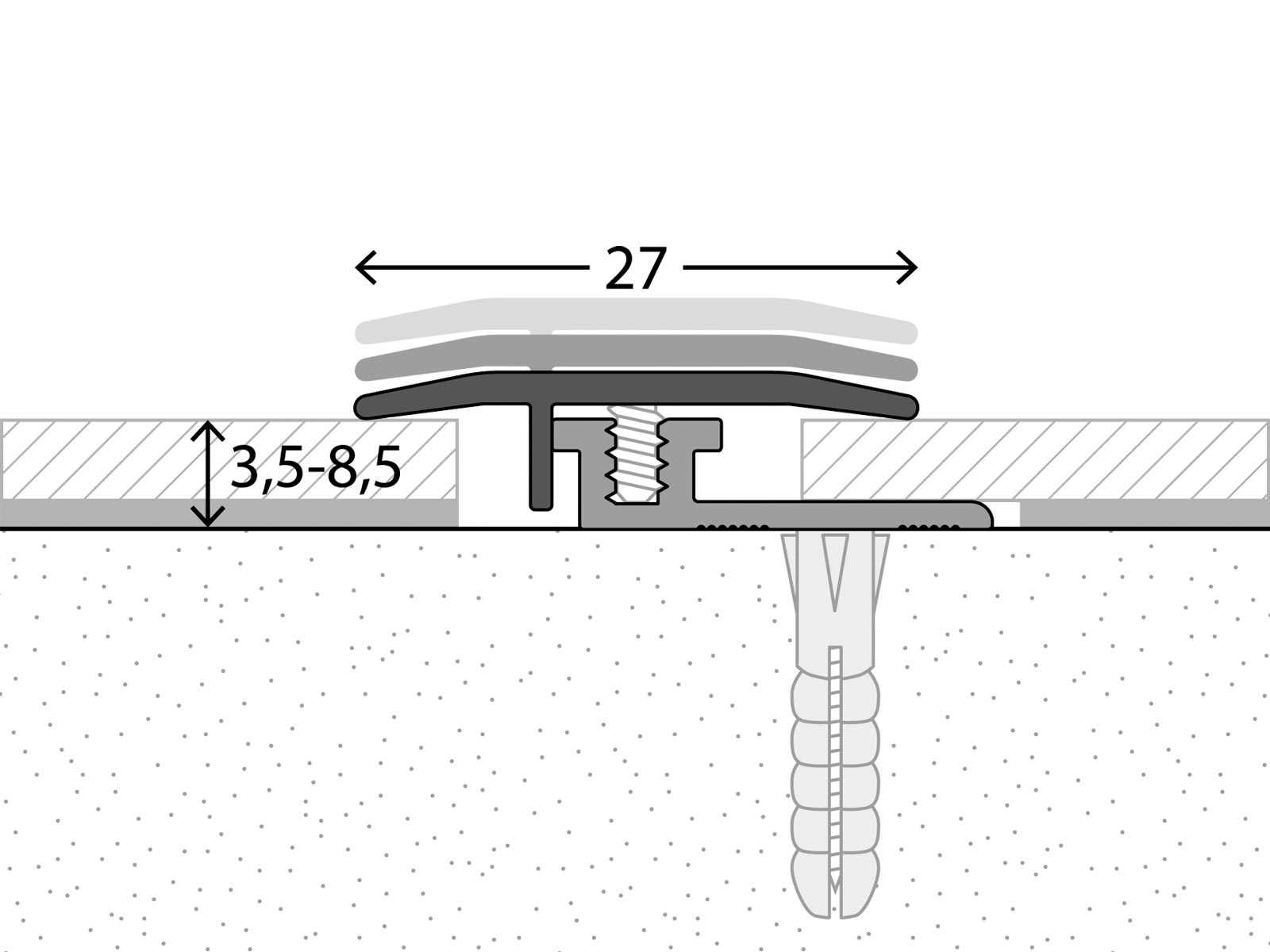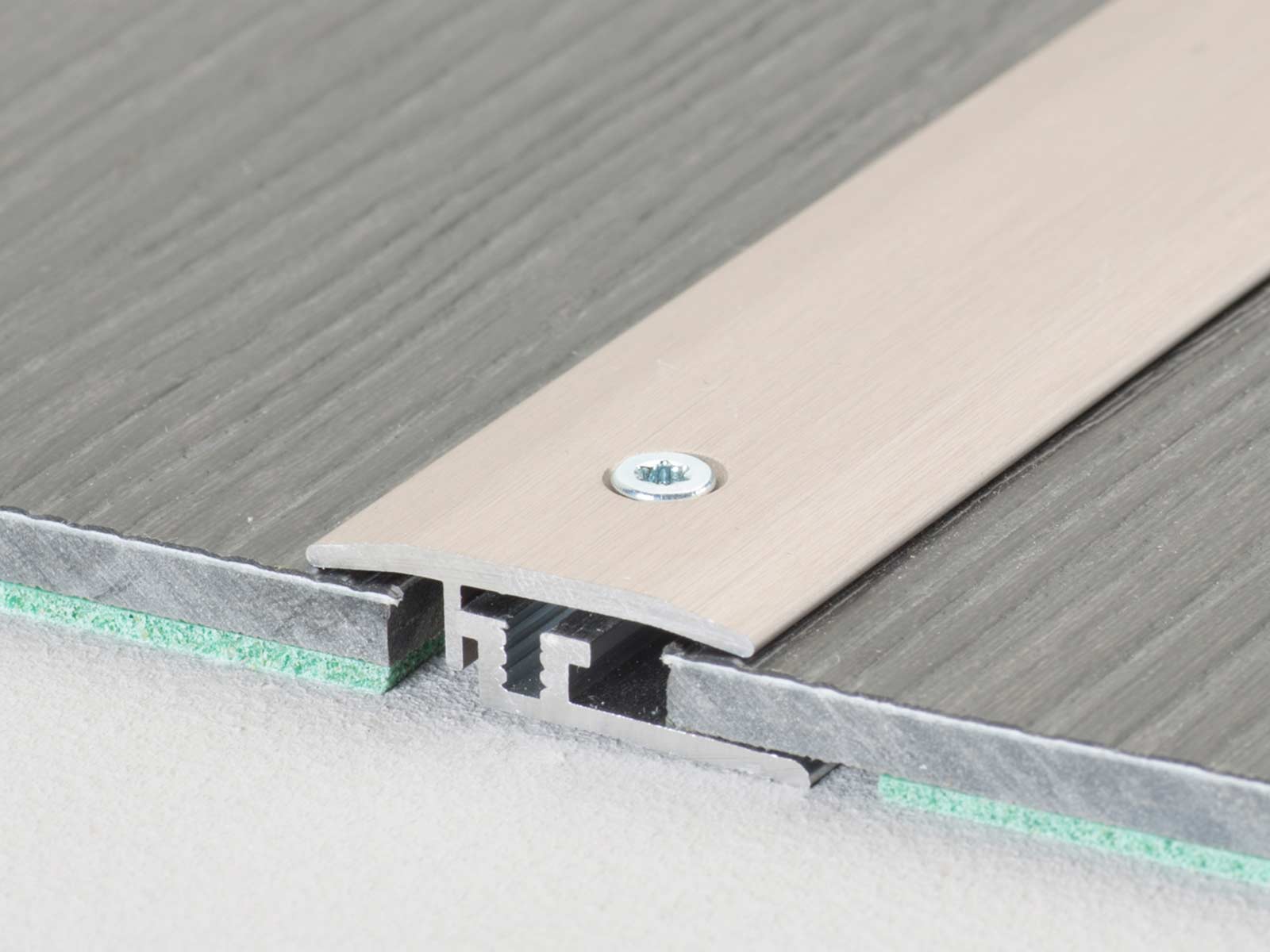Dieses Übergangsprofil wurde für schwimmend verlegte Designbeläge entwickelt, eignet sich aber auch für andere Bodenbeläge mit ähnlicher Aufbauhöhe. Die Konstruktion ist selbstjustierend bis 8,5mm, sodass kleinere Höhenunterschiede zuverlässig ausgeglichen werden. Mit einer Breite von 27mm bietet das Profil eine stabile und unauffällige Lösung.
