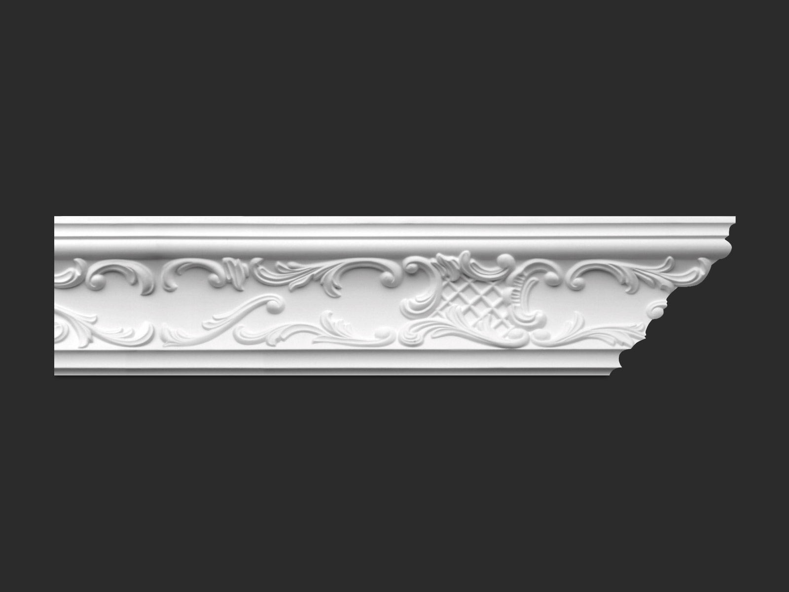 Die Zierleiste Romy aus expandiertem Polystyrol (Styropor) ist eine großformatige Deckenleiste für dekorative Abschlüsse im Innenbereich. Sie eignet sich besonders für hohe Räume oder Gestaltungen mit indirektem Licht. Die Oberfläche ist glatt, überstreichbar und kann auch als Trägerprofil für Beleuchtung verwendet werden.