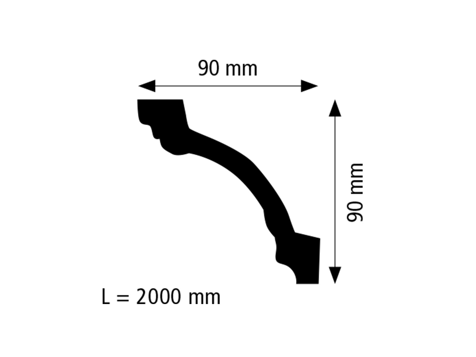 Das Material ist leicht, druckfest und für Feuchträume geeignet. Die Verarbeitung ist einfach, auch in stärker beanspruchten Bereichen. Das Profil misst 90x90mm und bildet einen markanten Übergang zwischen Decke und Wand.