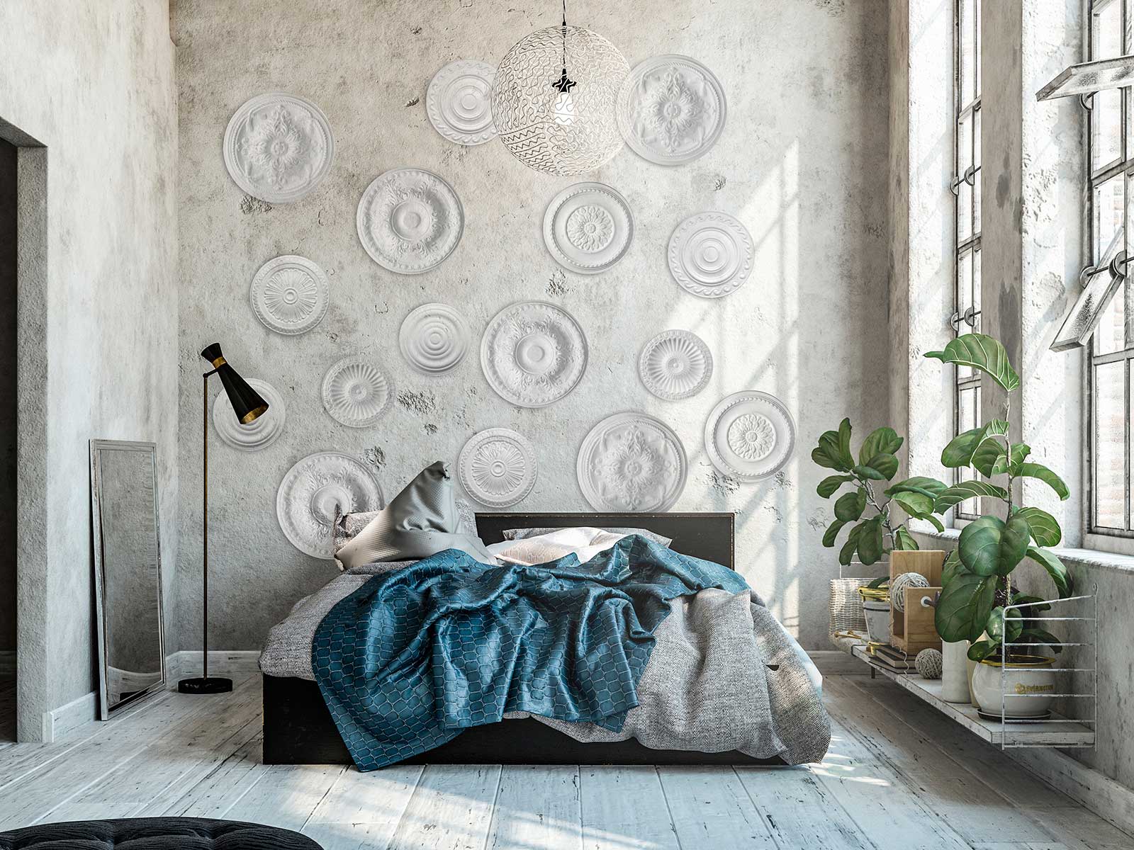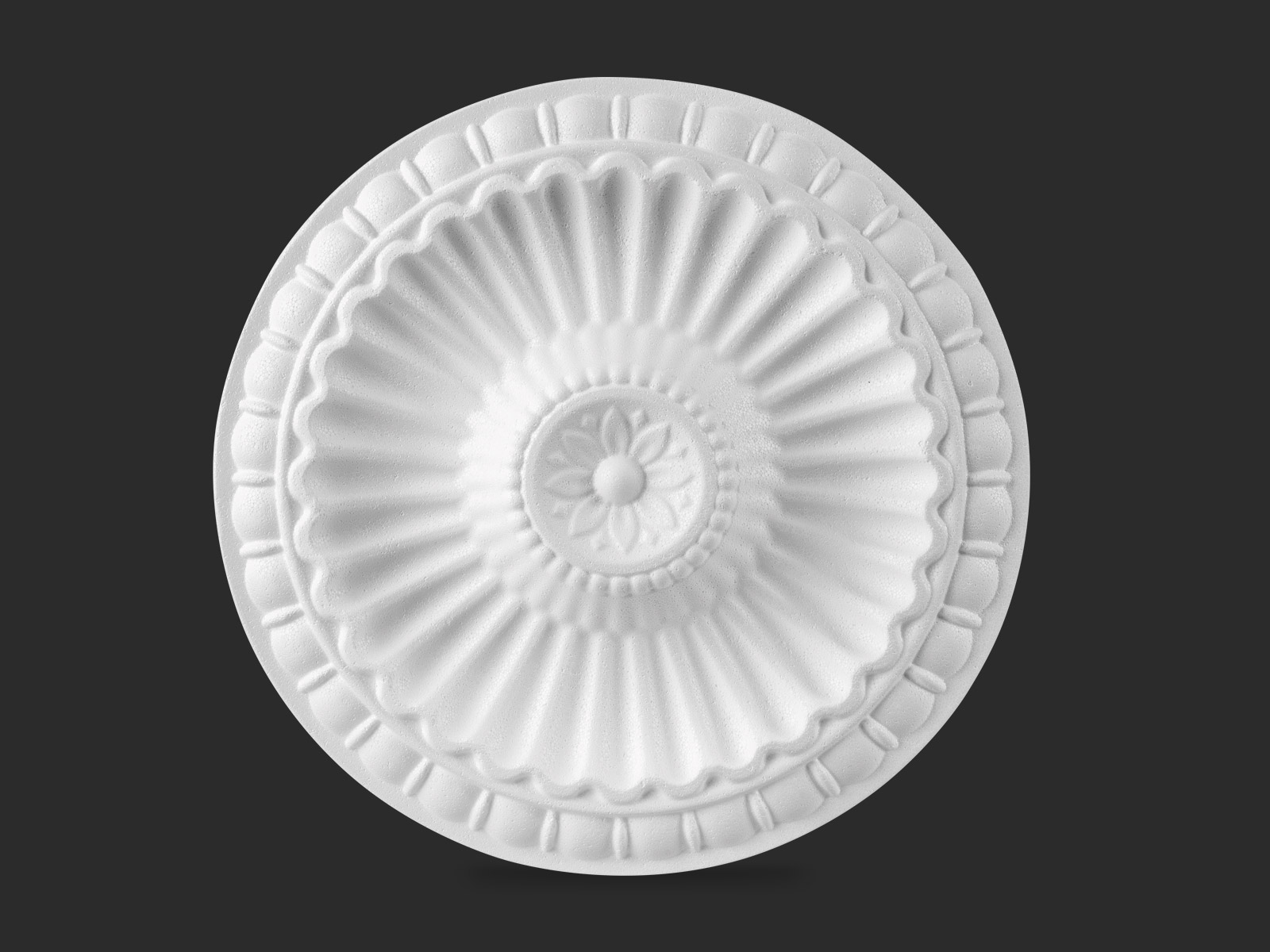 Die Deckenrosette Julia besteht aus formstabilem Styropor (Polystyrol) und eignet sich zur Gestaltung von Deckenanschlüssen, zum Beispiel als Abschluss für Leuchten oder Ventilatoren. Die Oberfläche ist glatt und kann mit Farben auf Wasser- oder Acrylbasis gestrichen werden.