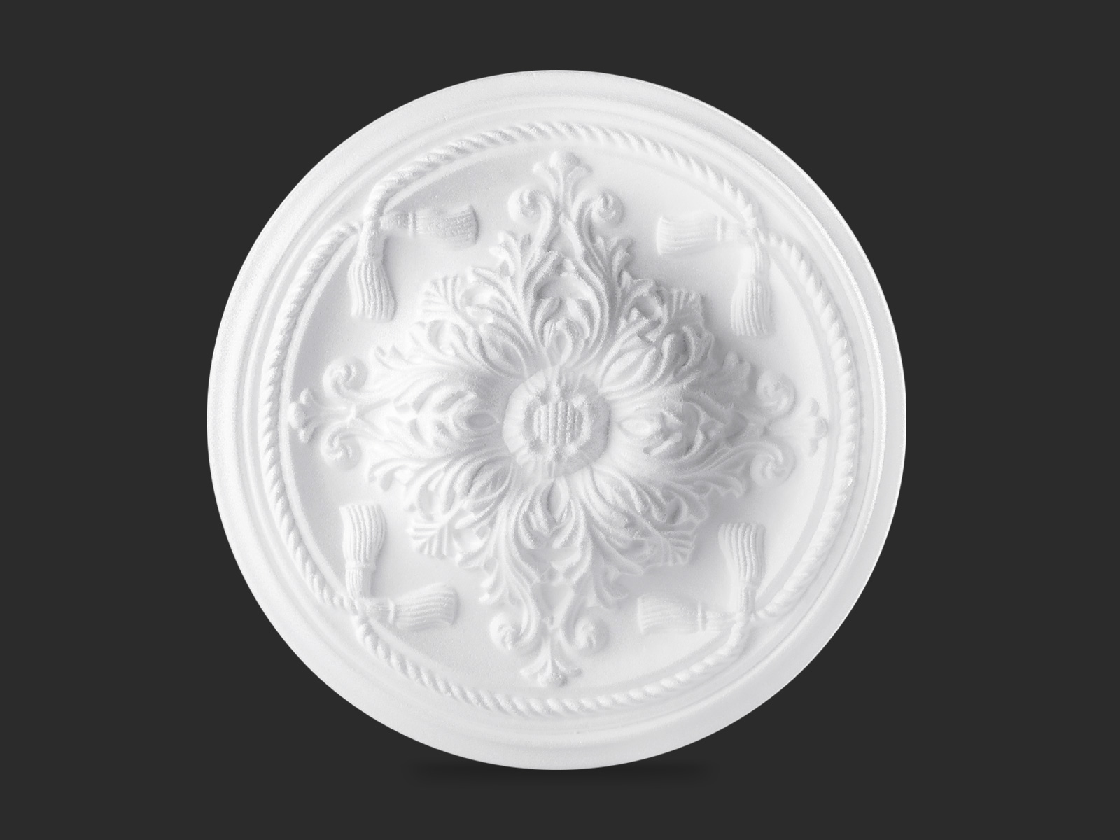 Die Deckenrosette K14 besteht aus Polystyrol und ist druckfest, formstabil und lösungsmittelfrei. Sie lässt sich leicht verarbeiten und mit handelsüblichen Acryl- oder Wandfarben überstreichen.
