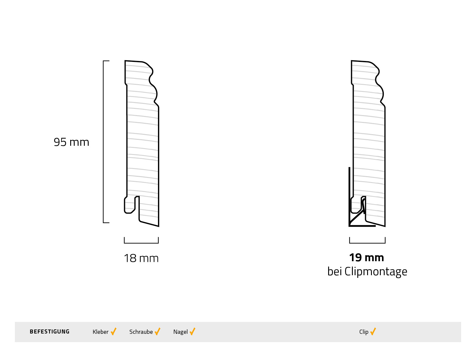Haben wir noch etwas vergessen? Ah ja stimmt, die Montage! Wenn Du störende Spalträume im Handumdrehen beseitigen willst, schaust Du am besten in unseren „Sockelleisten anbringen - Methodenübersicht“ Ratgeber. Dort findest Du eine Übersicht aller Methoden, der Vor- und Nachteile und genaue Anleitungen. Im How-To Ratgeber haben wir auch die typischen Fehler bei der Anbringung zusammengestellt, erzählen Dir alles über den Gehrungsschnitt und viele weitere, hilfreiche Texte / Videos.