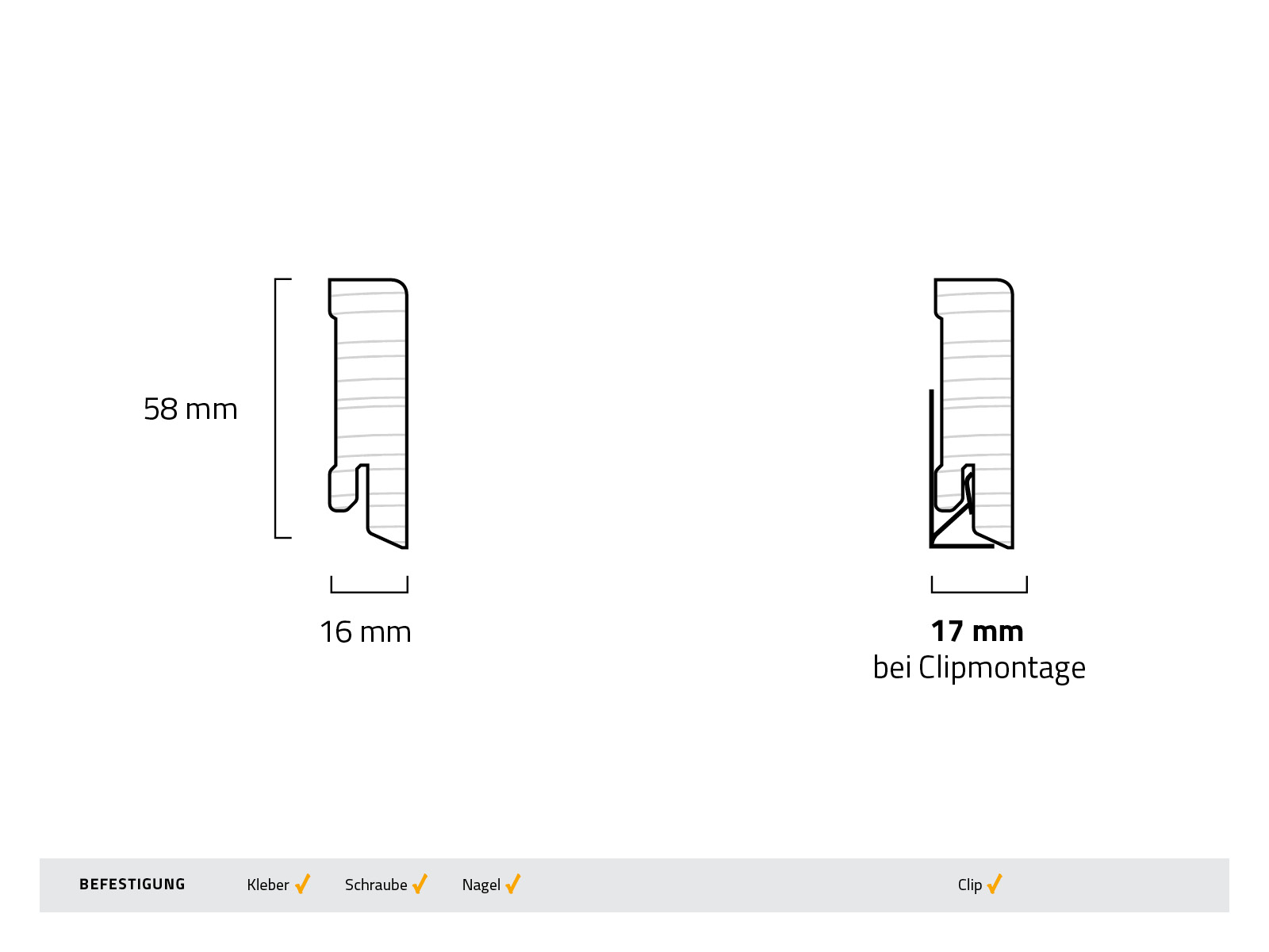 Unsere „Modern“ Sockelleisten aus Kiefer Massivholz sind in verschiedenen Größen erhältlich. Die 40 mm Variante eignet sich besonders für kleinere Räume oder wenn du einen dezenten Abschluss bevorzugst. Mit den 58 mm und 78 mm Leisten hast du die perfekte Wahl für mittelgroße bis große Räume, je nachdem, wie markant du den Übergang von Boden zu Wand gestalten möchtest. Die 95 mm Sockelleiste setzt ein kraftvolles Statement in Räumen mit hohen Decken oder großzügigen Flächen und unterstreicht die elegante Optik hochwertiger Bodenbeläge.