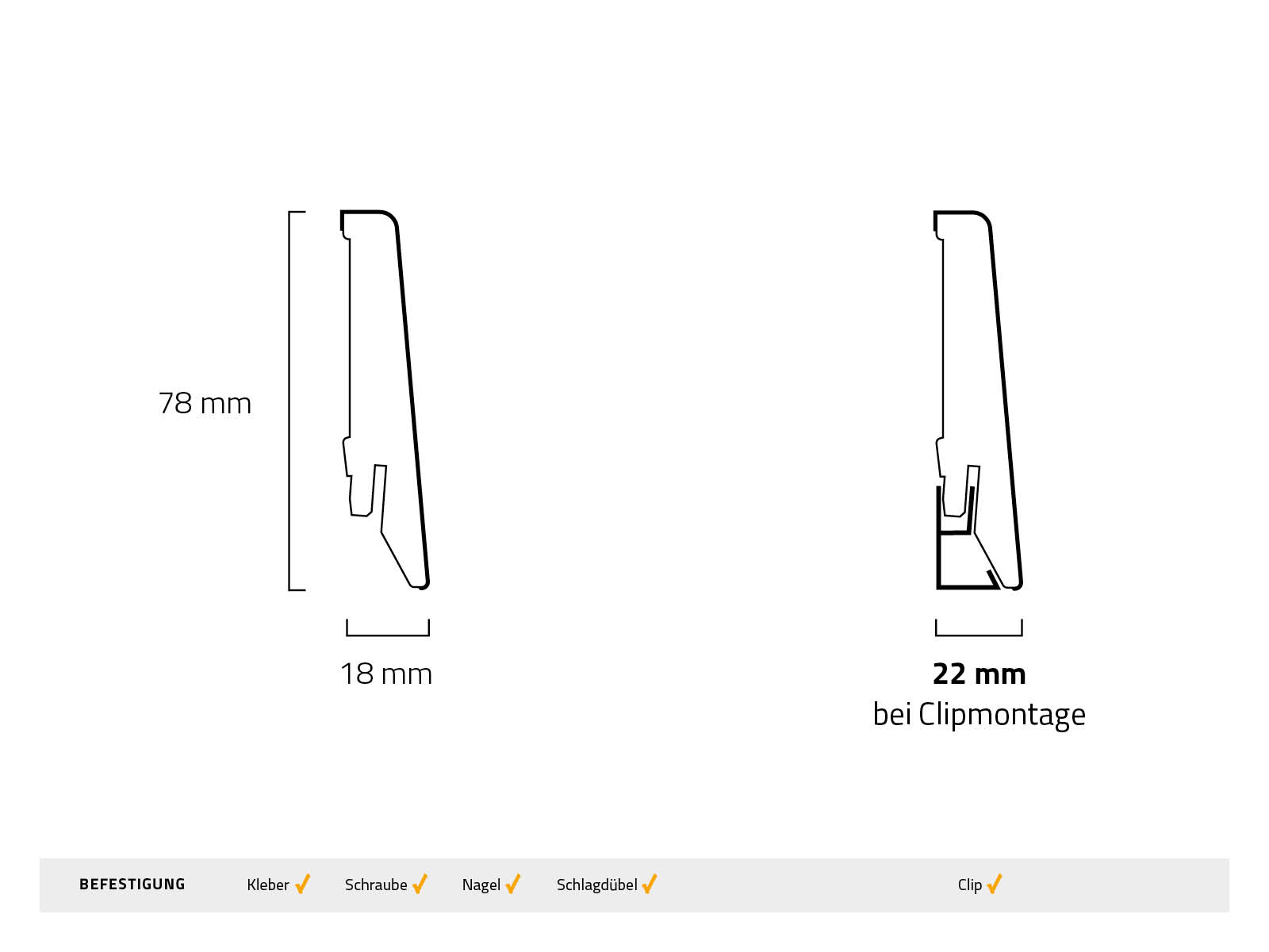 Für eine schnelle und mühelose Montage oder Demontage der MDF Sockelleiste MEGA-Profil sind unsere MEGA Sockelleisten Clips die ideale Lösung. Abhängig von der Beschaffenheit der Wand befestigst du einfach vier bis sechs Clips pro Leiste, im Abstand von etwa 40 bis 60 cm, mit Dübeln und Schrauben. Die Fußleisten werden dann einfach von oben aufgesteckt. Und voilà, fertig!