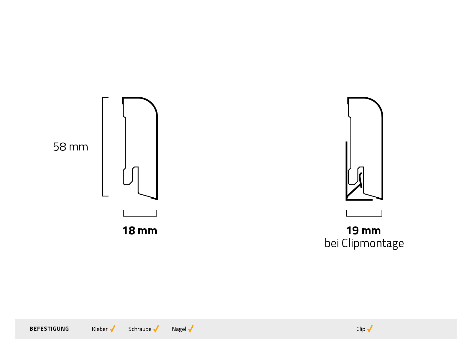 Die „Oben rund“ MDF Fußleisten sind außerdem in den Größen 58 mm und 76 mm erhältlich. Die 58 mm Variante eignet sich besonders für kleinere Räume oder wenn du einen dezenten Wandabschluss bevorzugst. Für größere Räume oder Räume mit höheren Decken bietet sich die 76 mm Leiste an, die für einen markanteren und dennoch eleganten Look sorgt. So hast du immer die passende Größe für dein Zuhause, egal wie die Raumverhältnisse aussehen.