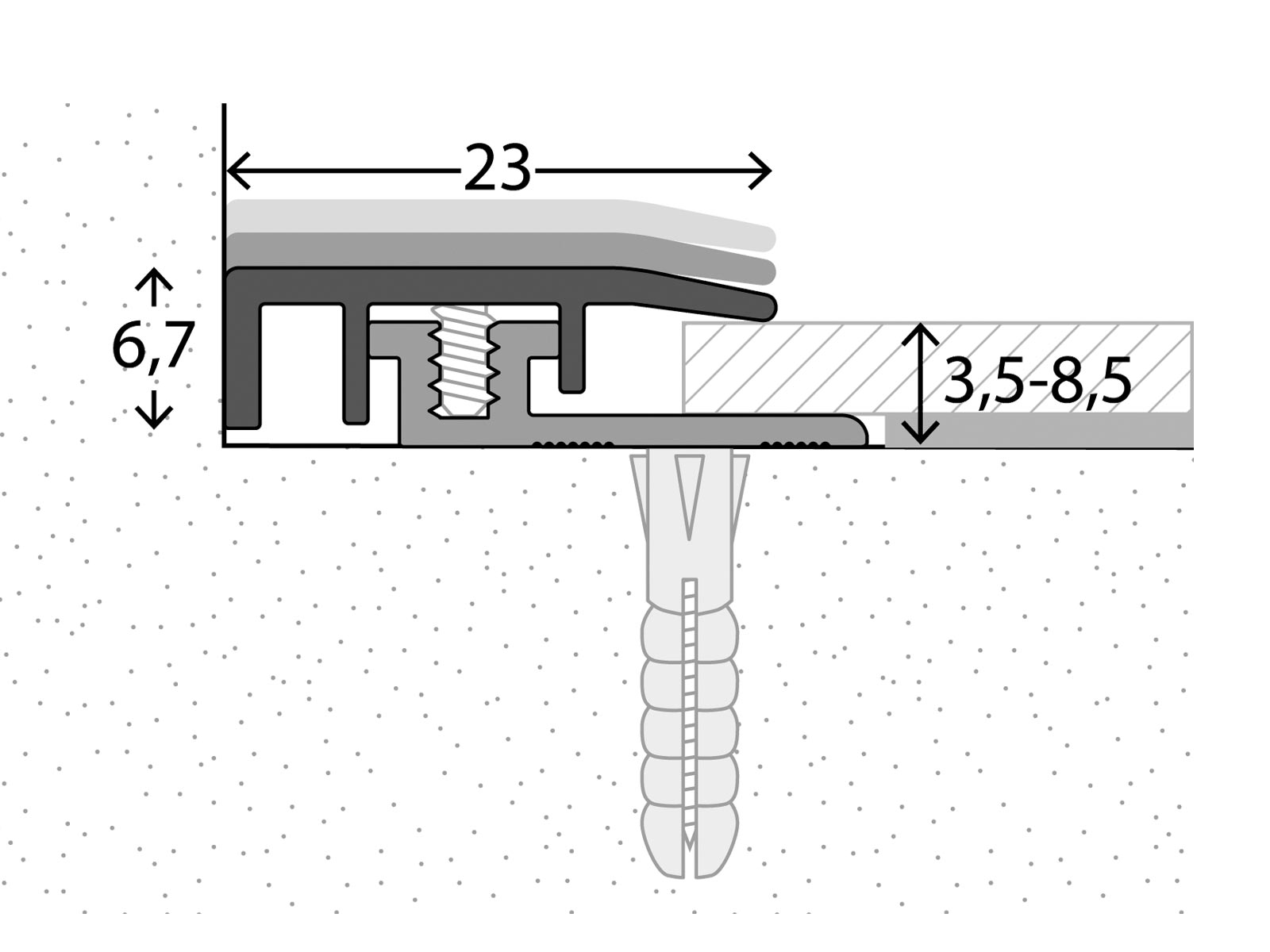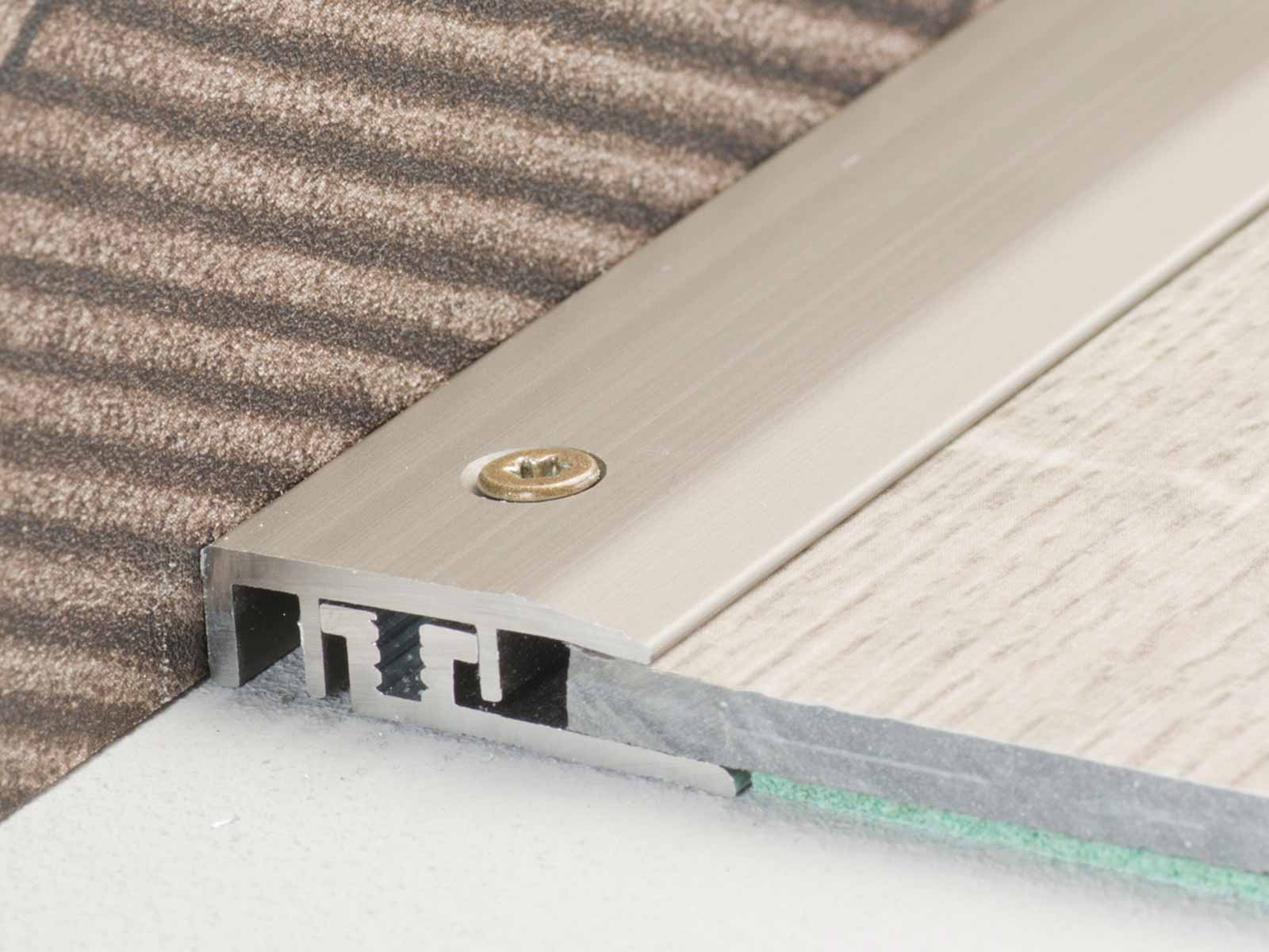 Nach der Befestigung des Basisprofils auf dem Untergrund erfolgt die Verlegung des Bodenbelages. Mit den beigefügten Schrauben wird das Oberprofil anschließend im Schraubkanal befestigt. Fertig. Die schmalen, flachen Profile überzeugen durch eine perfekte Optik und bieten gleichzeitig großzügige Dehnungsfugen für die Dimensionsschwankungen des Bodenbelages.