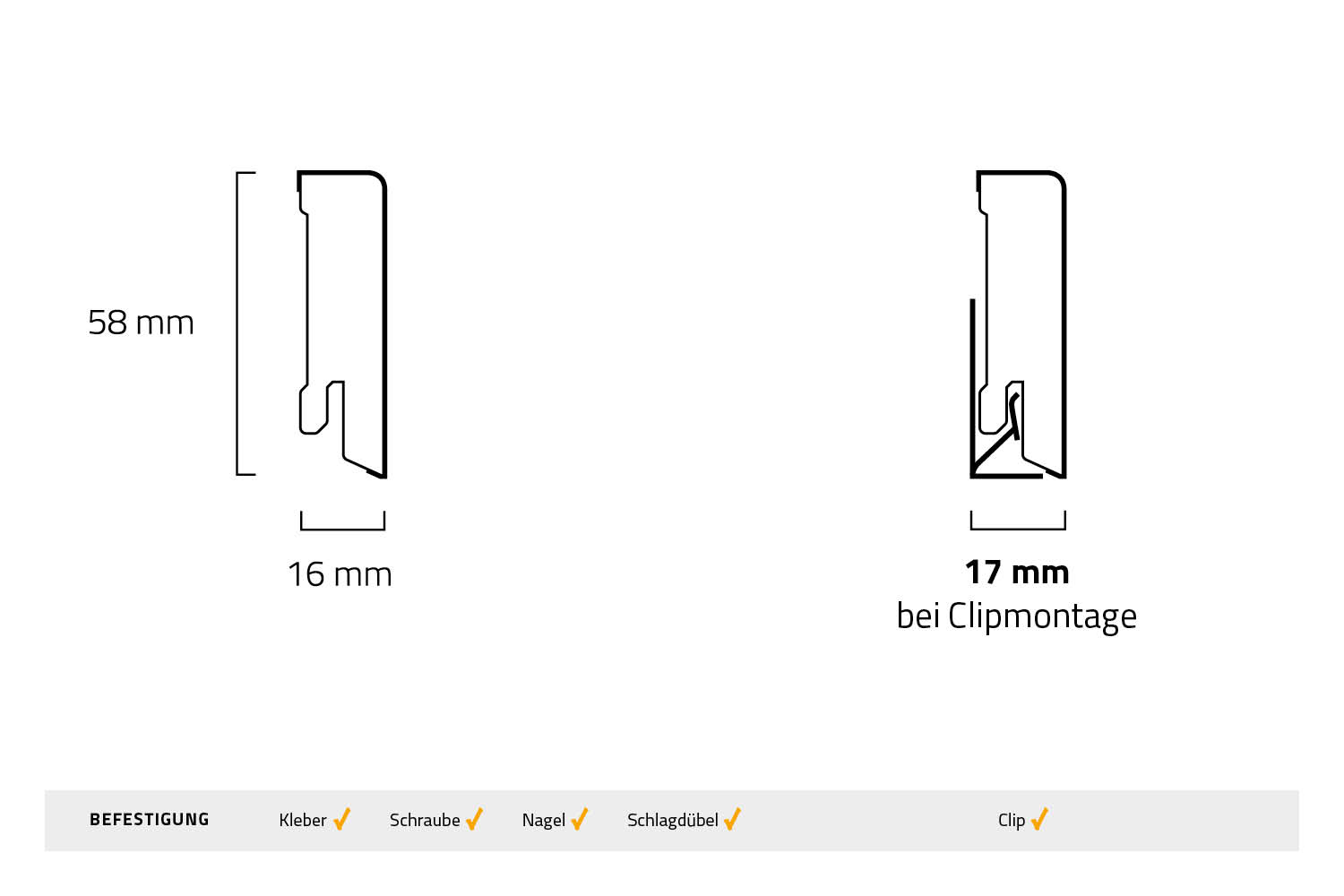 Außerdem findest du in unserem Sortiment die passenden Montageclips, mit denen die Installation kinderleicht von der Hand geht. Damit verwandelst du deine Wohnung ganz entspannt von „halbfertig“ zu „vorzeigbar“ – und das zu einem richtig fairen Preis-Leistungs-Verhältnis.