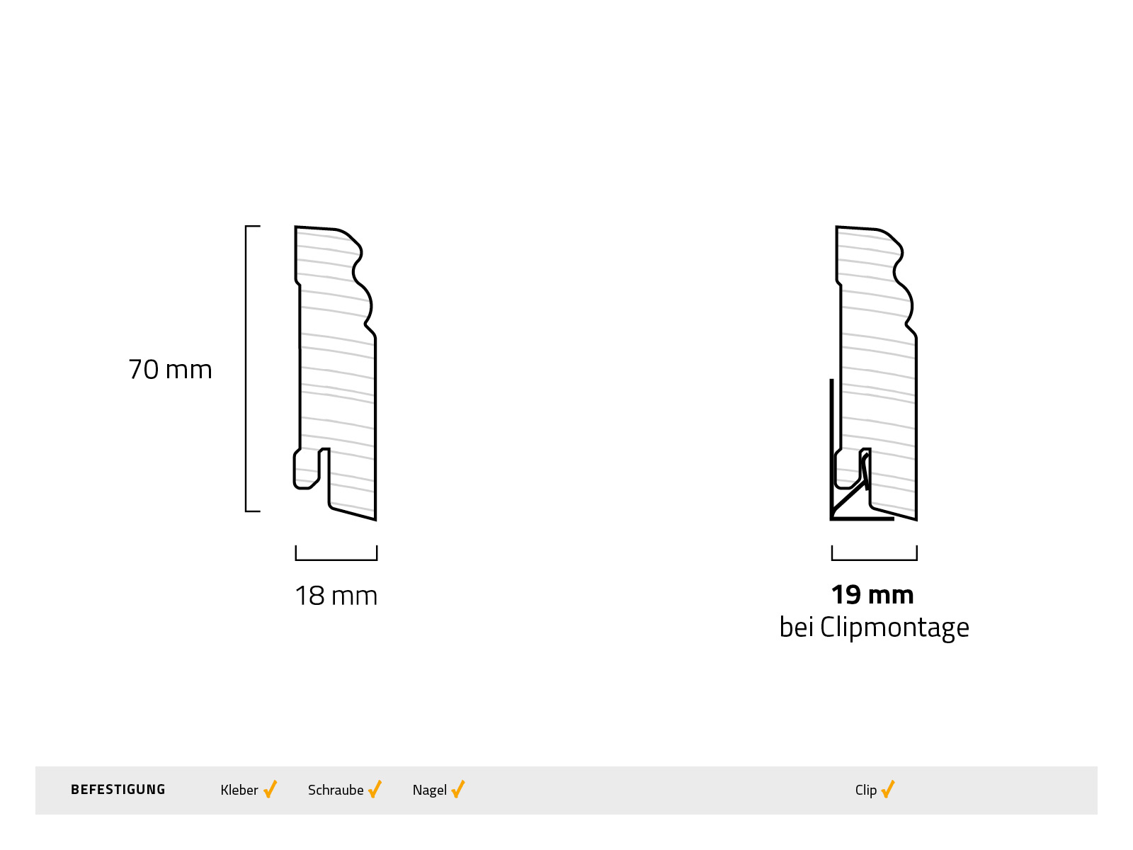 Die Montage ist auf verschiedene Arten möglich: klassisch mit Schrauben mit weißem Kopf, mit Montagekleber oder – bei vorhandener Nut – mit Clips.