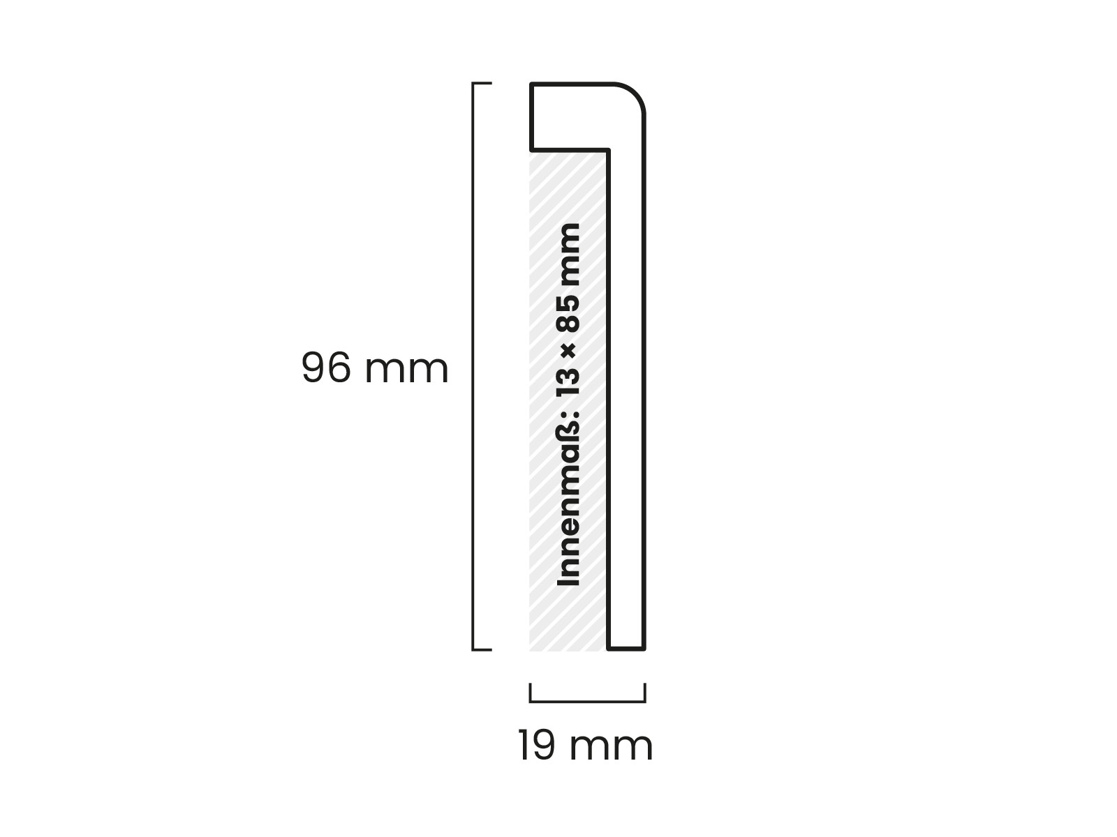 Die Leiste hat ein Maß von 19x96x2500mm. Die Aussparung auf der Rückseite misst 13mm in der Tiefe und 85mm in der Höhe. Damit eignet sie sich zum Überdecken vieler gängiger Fliesensockel. Die Oberfläche ist feuchtigkeitsbeständig, stoß- und kratzfest.