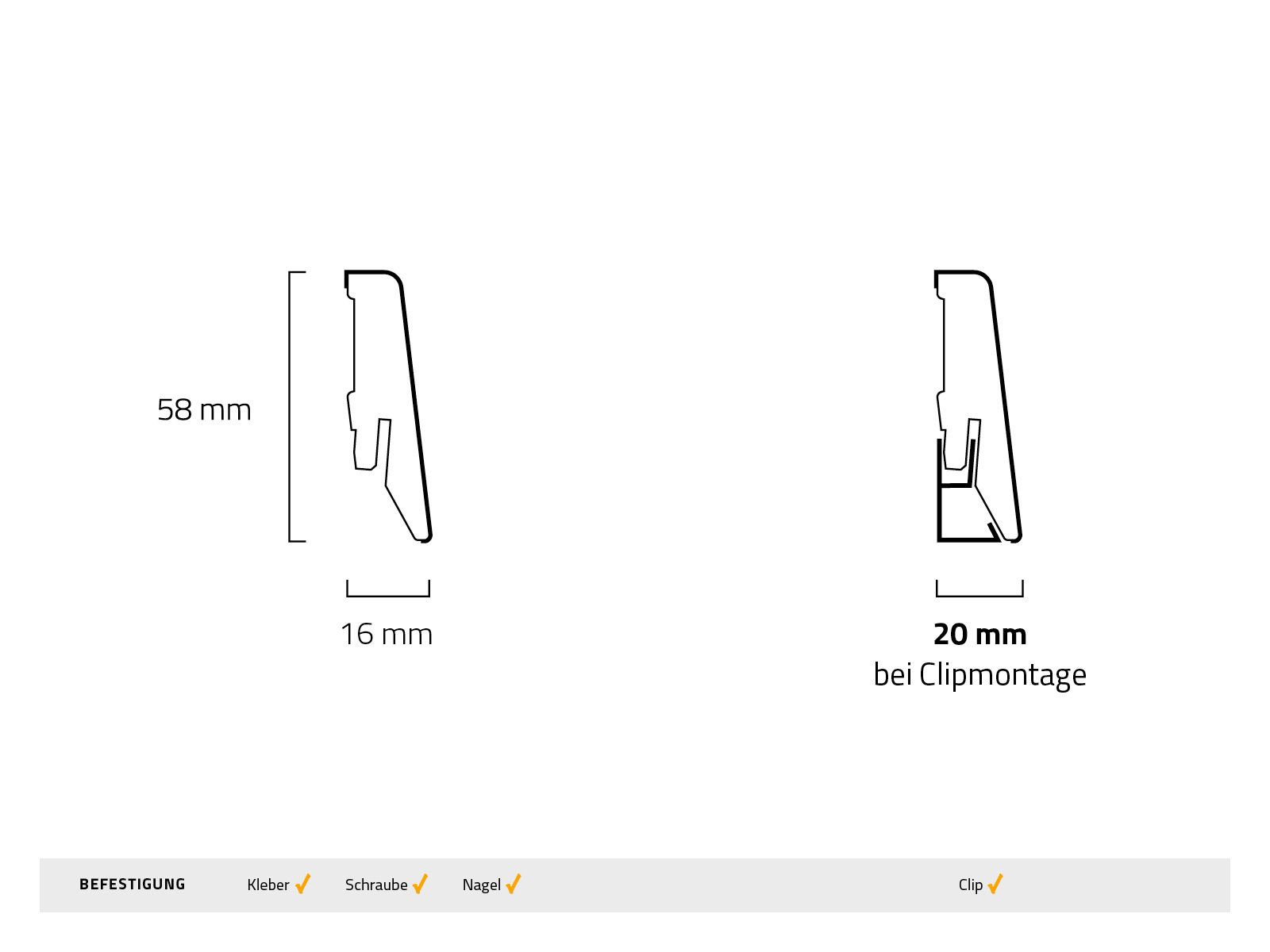 Die Leiste kann mit Montagekleber befestigt werden. Der Kleber wird punktuell aufgetragen, anschließend wird die Leiste angedrückt. Alternativ ist die Befestigung mit ExPress Clips möglich – besonders praktisch, wenn die Leiste später noch entfernt werden soll. Pro Meter sollten 2 bis 3 Clips eingeplant werden, abhängig von der Wandbeschaffenheit.