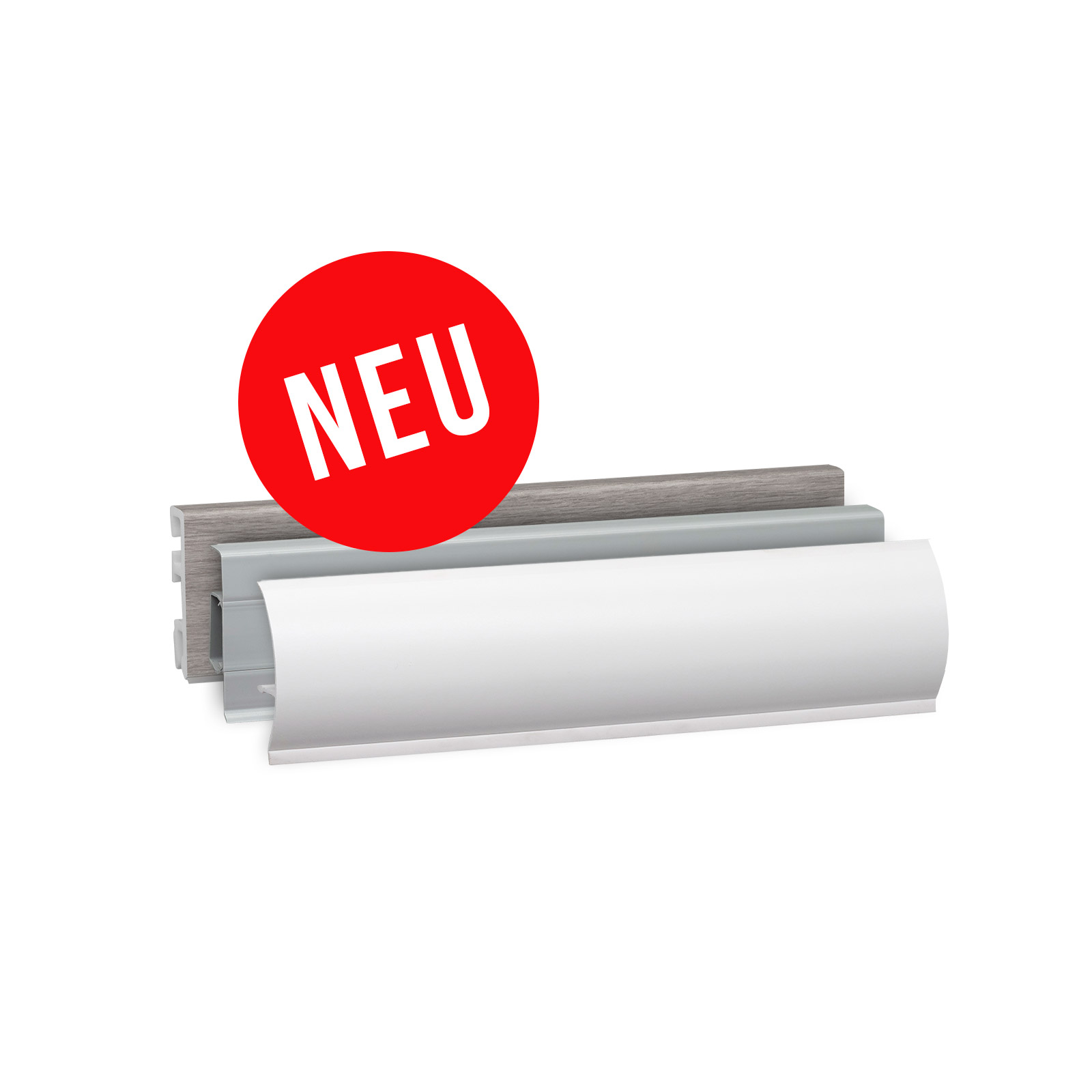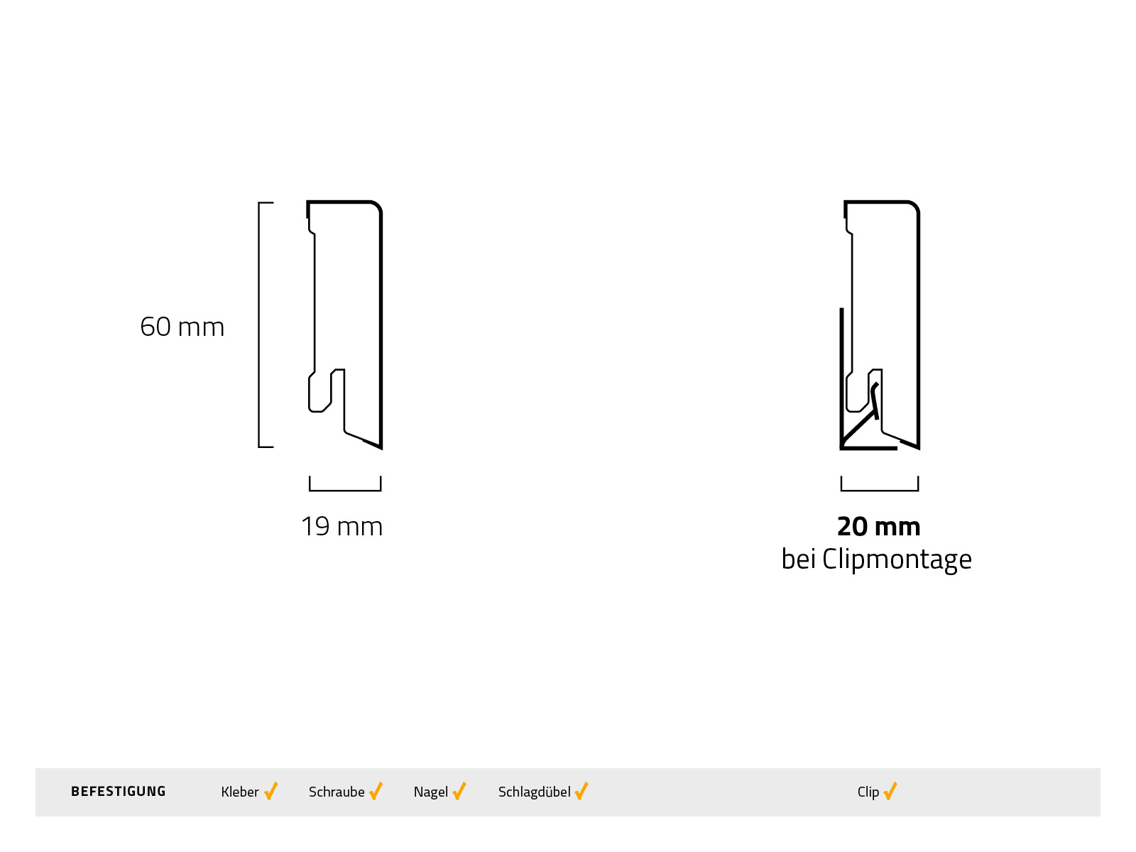 Auf der Rückseite befindet sich eine integrierte Nut zur verdeckten Kabelführung. Durch die PUR-Verleimung bleibt die Leiste auch bei erhöhter Luftfeuchtigkeit formstabil. Mit 60mm Höhe, 19mm Tiefe und 2.400mm Länge ist sie vielseitig einsetzbar. Hergestellt in Deutschland aus MDF mit geprüfter Feuchtraumqualität.