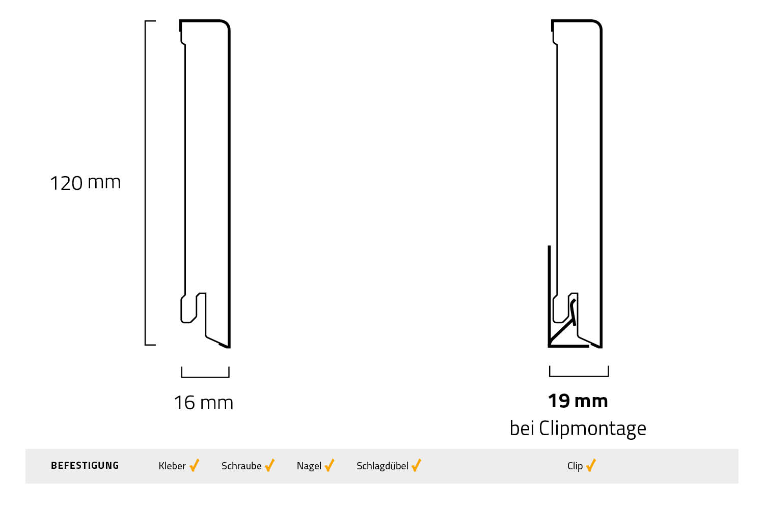 | Befestigungsart: | Kleber, Schlagdübel, Schraube |
