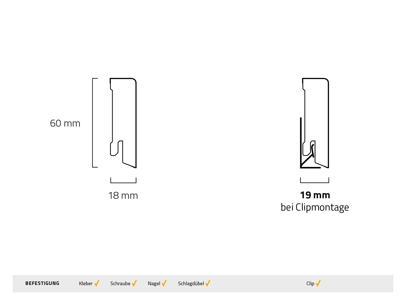 | Befestigungsart: | Clip, Kleber, Schlagdübel, Schraube |