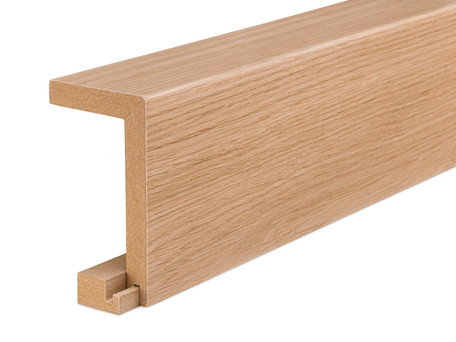 Passende Innenecken und Außenecken sind separat erhältlich. Beide sind mit echtem Eichefurnier versehen und auf das Profil abgestimmt. Außenecken können auch als Endstücke genutzt werden, wenn die Leiste an einer freien Wandseite endet.