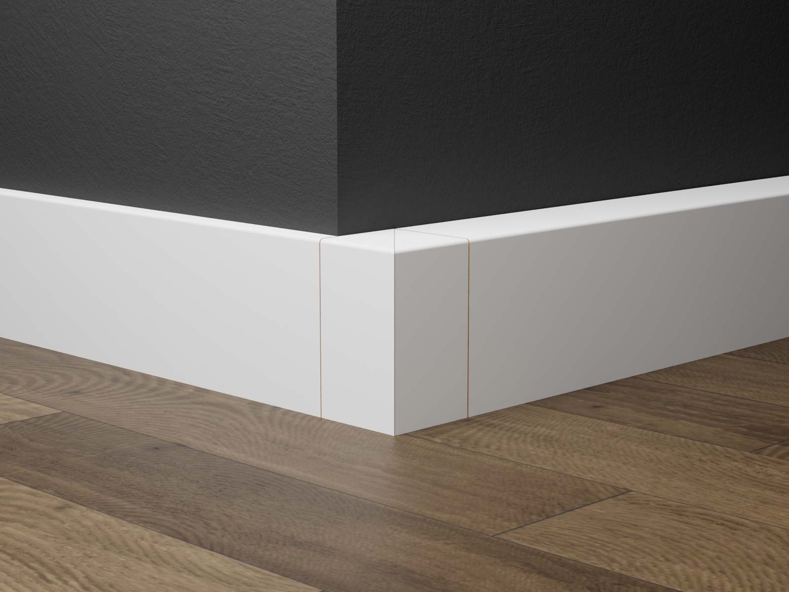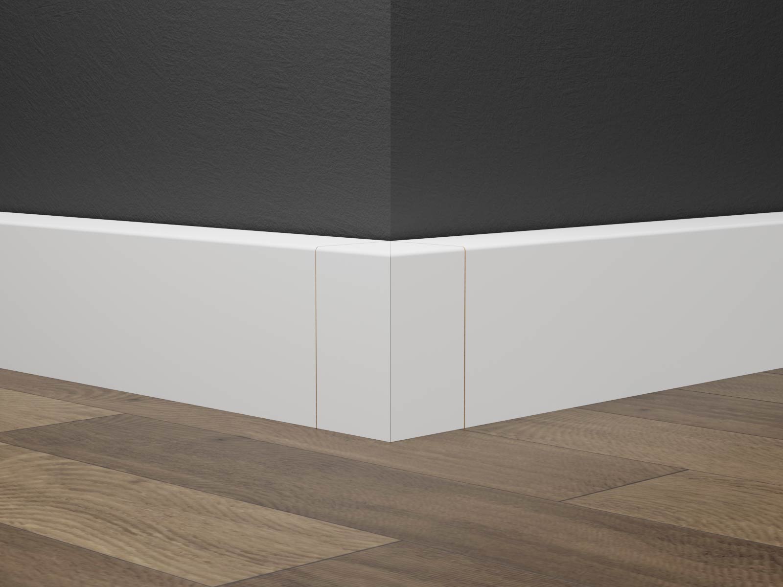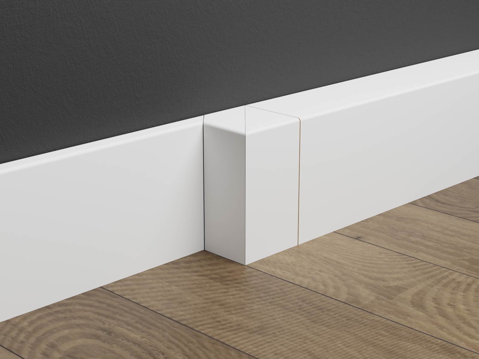 Passende Innenecken und Außenecken sind separat erhältlich. Sie sind exakt auf das Profil abgestimmt und sorgen für bündige Übergänge. Außenecken können auch als Endstücke verwendet werden, wenn die Leiste an einer freien Wandseite endet.