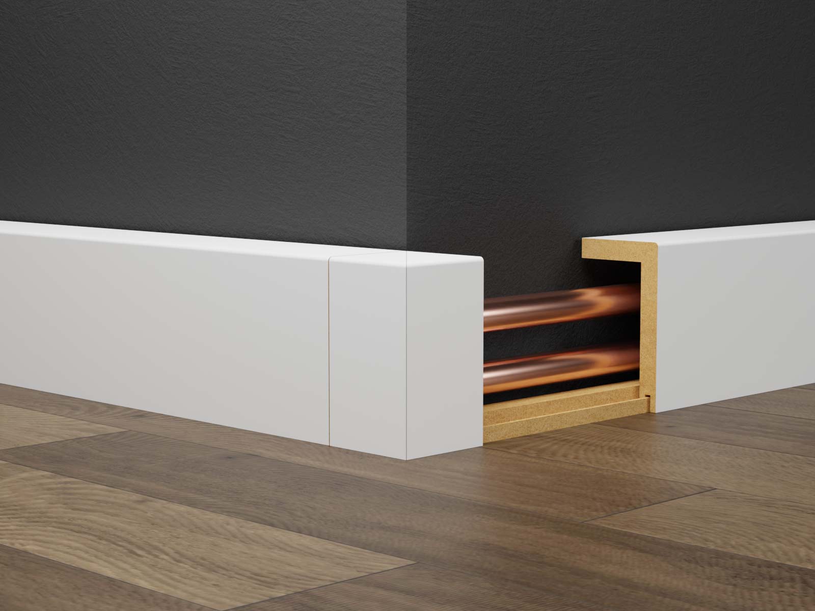 Die Leiste hat die Maße 57 x 100 x 2.400 mm bei einem Innenmaß von 45 x 88 mm. Damit lassen sich zwei Heizungsrohre zuverlässig verdecken. Das MDF-Material sorgt für Formstabilität und eine gleichmäßige Oberfläche. Die Folienbeschichtung ist pflegeleicht und widerstandsfähig im täglichen Gebrauch.