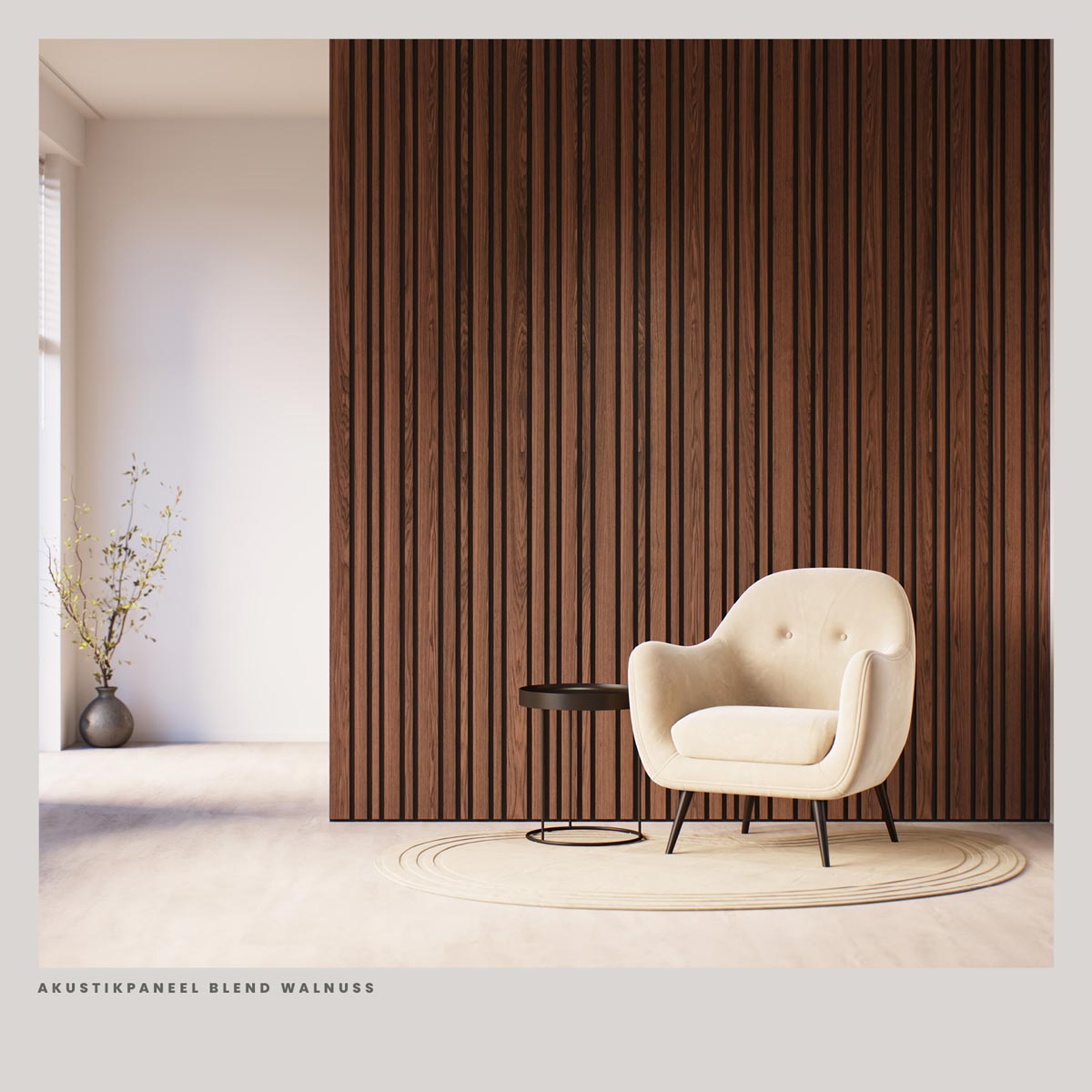 Die Paneele bestehen aus MDF-Lamellen mit einer Oberfläche in Walnuss. Auf der Rückseite ist ein Filzträger angebracht. Dieser Aufbau hilft dabei, den Nachhall im Raum zu verringern, sodass Geräusche weniger zurückgeworfen werden und Gespräche ruhiger wirken. Es geht dabei um die Verbesserung der Raumakustik und nicht um eine Schalldämmung nach außen.