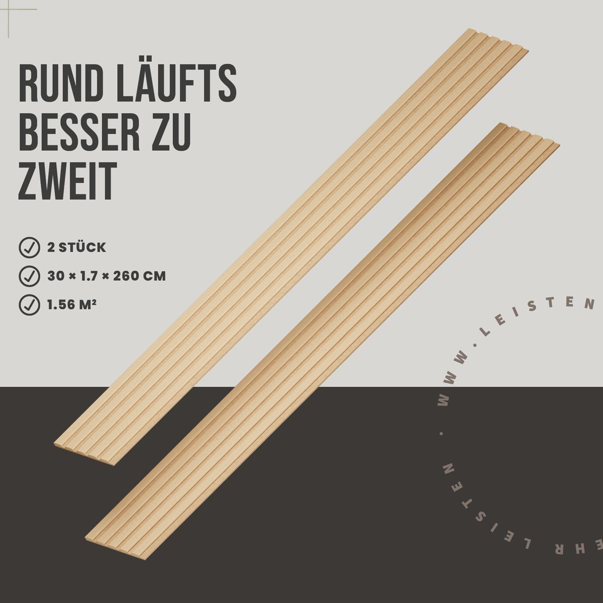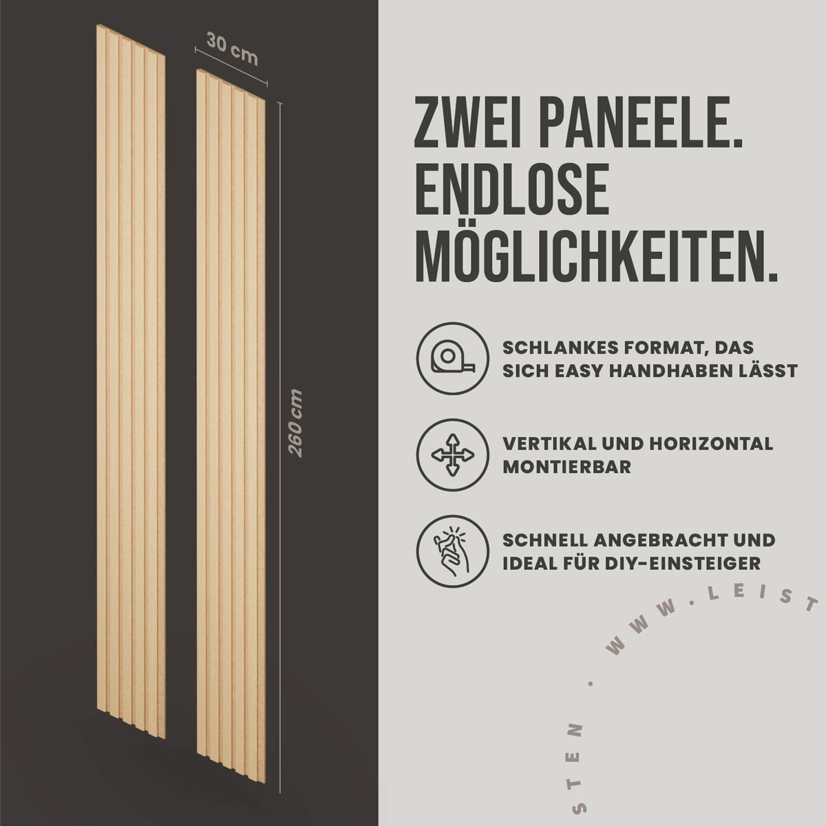 Ein Set besteht aus zwei Paneelen im Format 30 × 260 cm. Damit lassen sich insgesamt 1,56 m² Wandfläche gestalten. Die Paneele eignen sich sowohl für einzelne Akzentflächen als auch für komplette Wandverkleidungen.