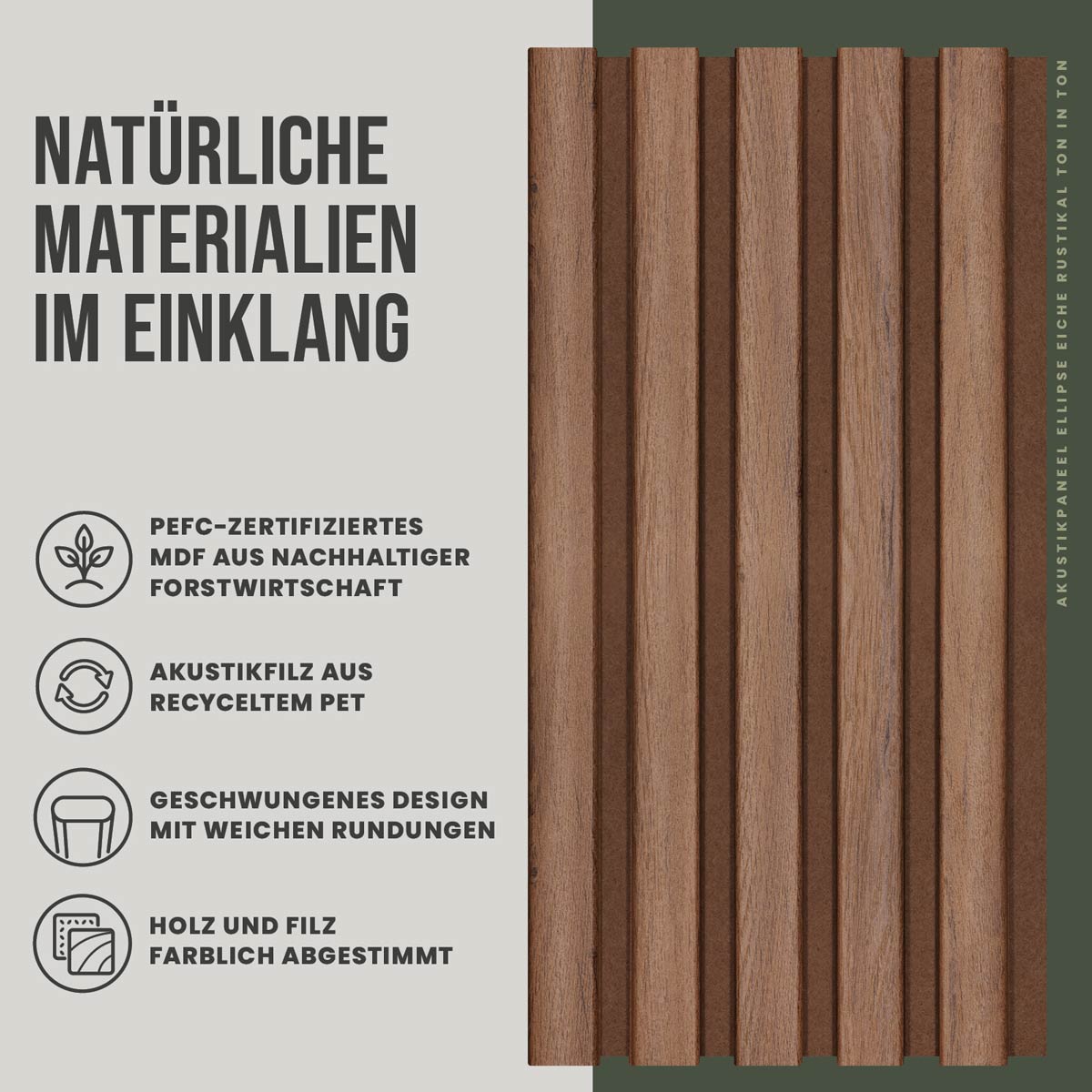 Die verwendeten Holzwerkstoffe sind PEFC-zertifiziert und stammen aus verantwortungsvoll bewirtschafteten Wäldern. Damit verbinden die Ellipse Paneele modernes Wanddesign mit einer nachhaltigen Materialbasis.