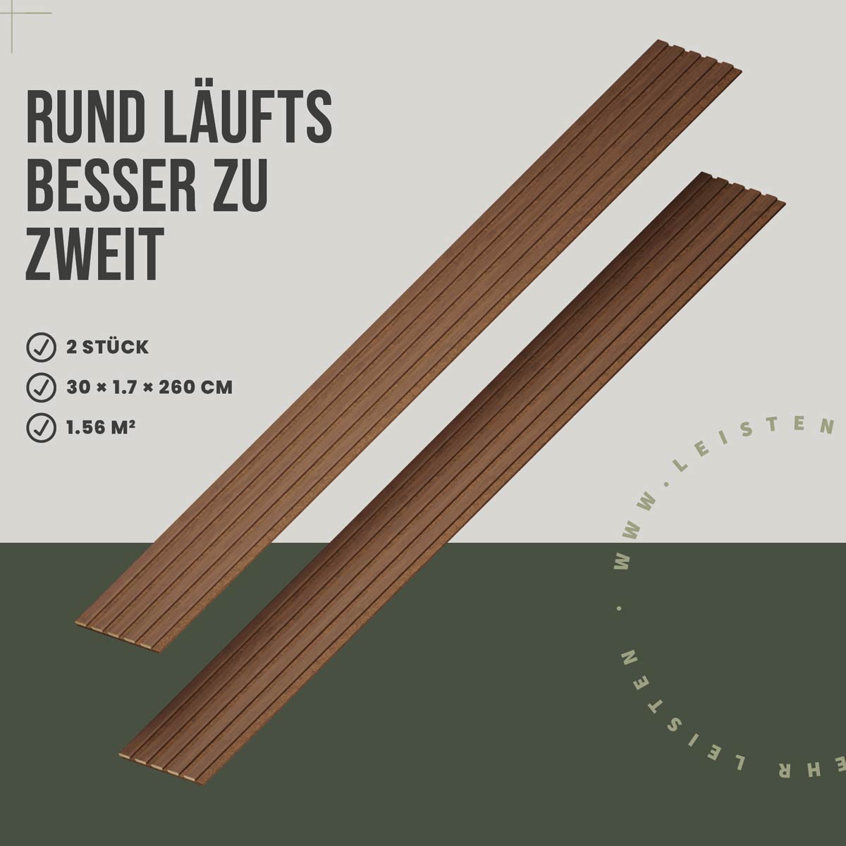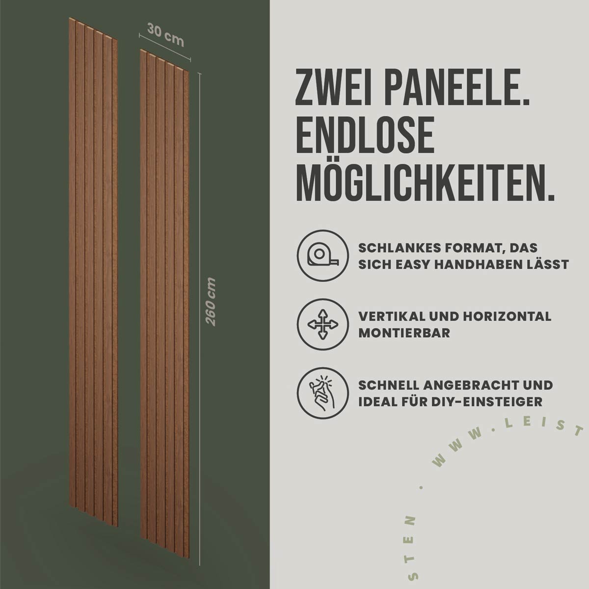 Das Set besteht aus zwei Paneelen im Format 30 × 260 cm. Damit lassen sich insgesamt 1,56 m² Wandfläche verkleiden. Die Paneele eignen sich sowohl für dekorative Akzentflächen als auch für größere Wandbereiche.