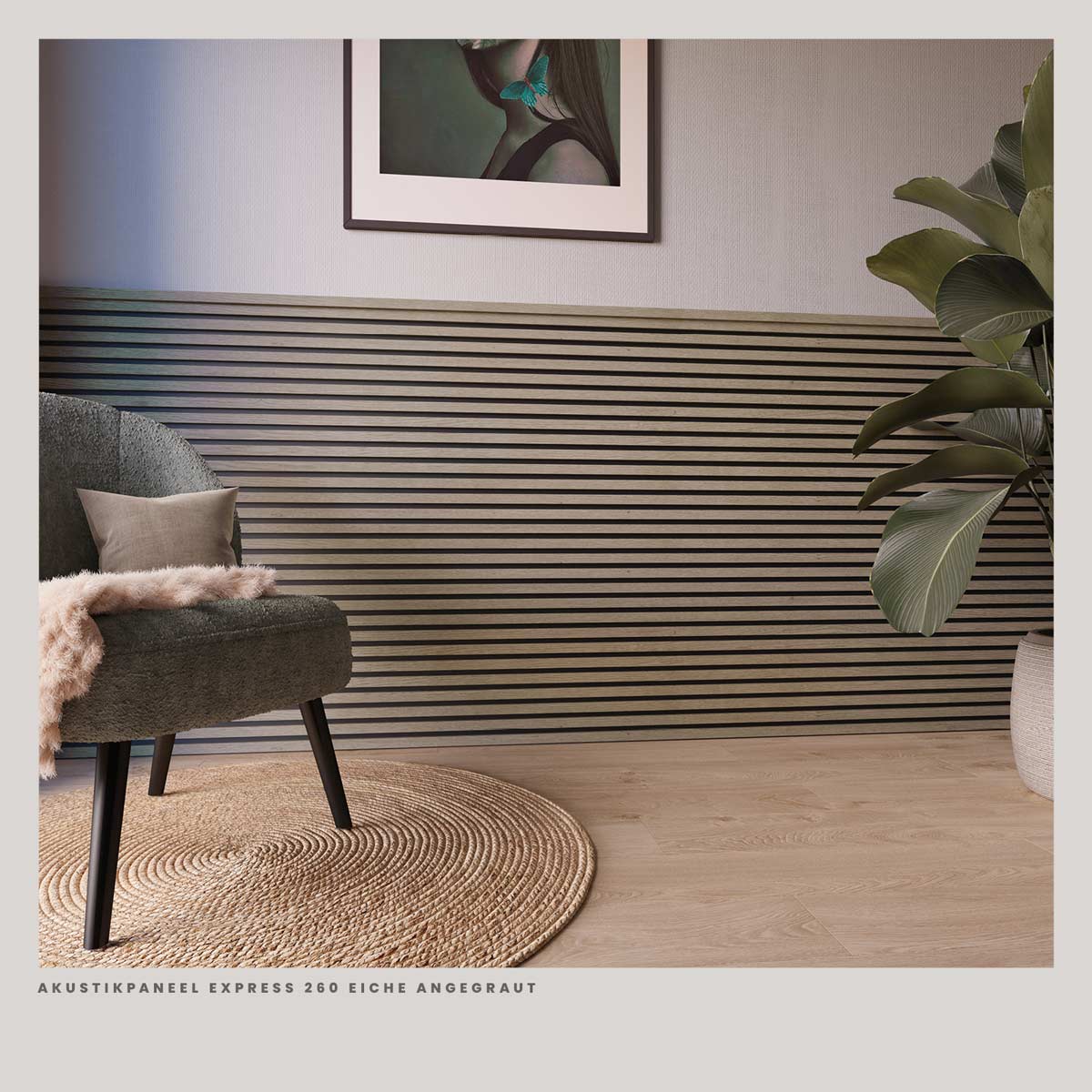 Mit den Maßen 1,8 × 2,2 × 260 cm ist die Abschlussleiste auf Akustikpaneele im Format 30 x 1,7 x 260 cm abgestimmt. Die Oberfläche in Eiche angegraut passt optisch zu den Paneelen und führt das Erscheinungsbild gleichmäßig weiter. Das Profil fällt nicht auf, sondern schließt die Wand sauber ab.