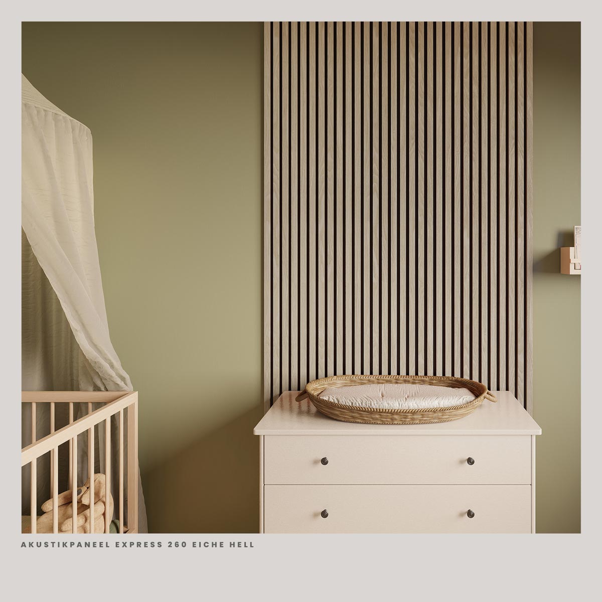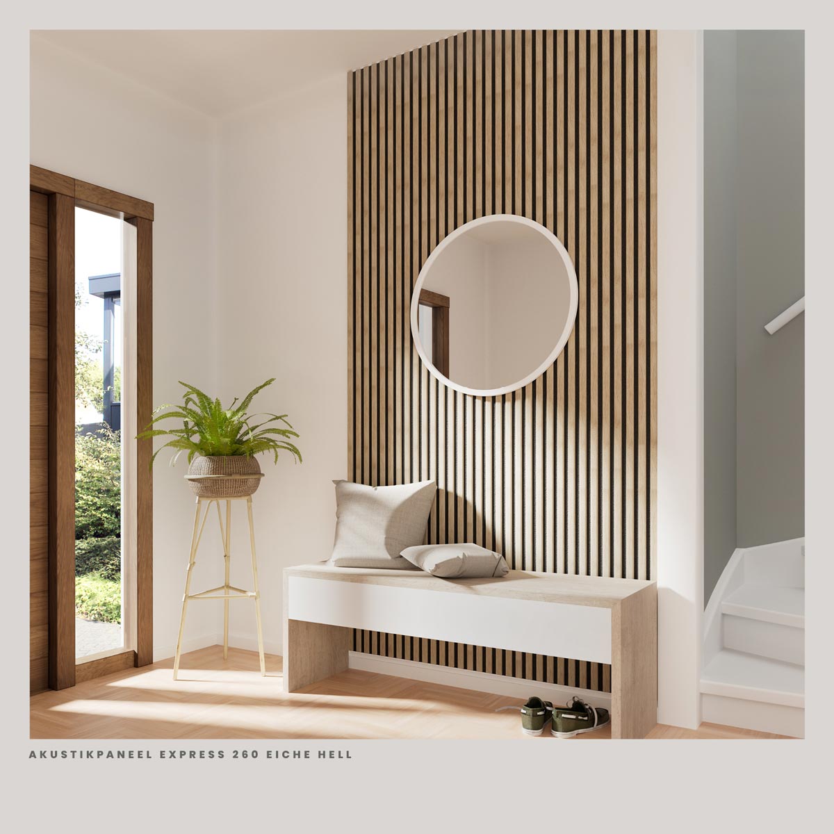 Die Paneele bestehen aus MDF-Lamellen mit einer Oberfläche in Eiche hell. Auf der Rückseite sitzt ein Filzträger. Dieser Aufbau hilft dabei, den Nachhall im Raum zu verringern, sodass Gespräche weniger hallen und der Raum insgesamt ruhiger wirkt. Es geht dabei nicht um Schalldämmung nach außen, sondern um eine bessere Akustik im Raum selbst.