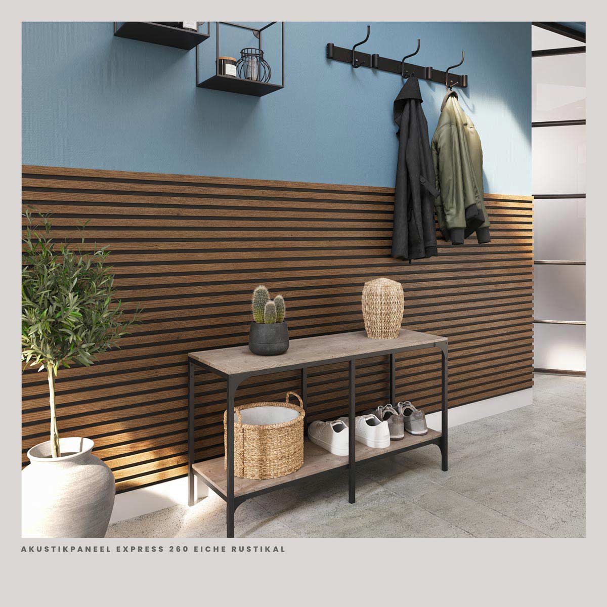 Die Paneele bestehen aus MDF-Lamellen mit einer Oberfläche in Eiche Rustikal. Auf der Rückseite sitzt ein Filzträger. Dieser Aufbau hilft dabei, den Nachhall im Raum zu verringern, sodass Gespräche weniger hallen und der Raum insgesamt ruhiger wirkt. Es geht dabei nicht um Schalldämmung nach außen, sondern um eine bessere Akustik im Raum selbst.