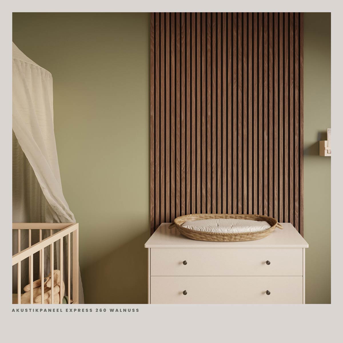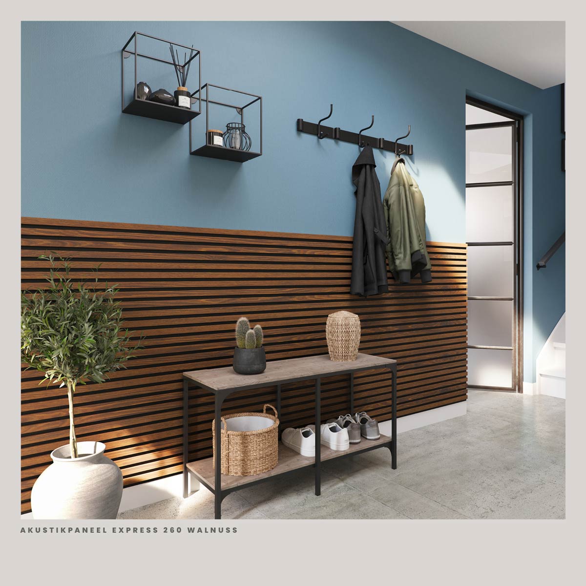 Die Paneele bestehen aus MDF-Lamellen mit einer Oberfläche in Walnuss. Auf der Rückseite sitzt ein Filzträger. Dieser Aufbau hilft dabei, den Nachhall im Raum zu verringern, sodass Gespräche weniger hallen und der Raum insgesamt ruhiger wirkt. Es geht dabei nicht um Schalldämmung nach außen, sondern um eine bessere Akustik im Raum selbst.