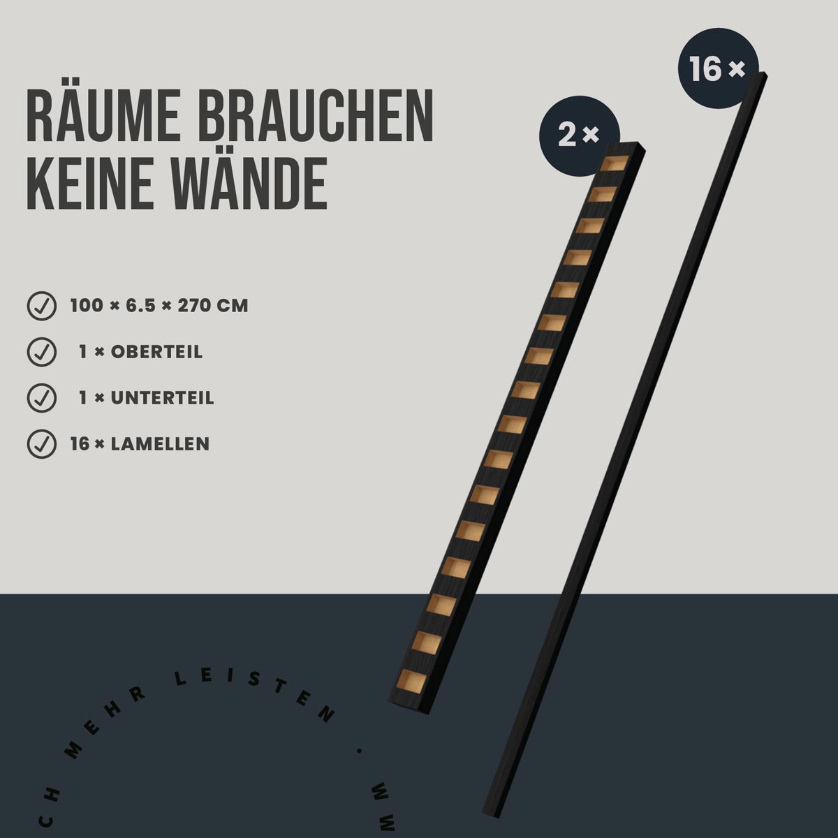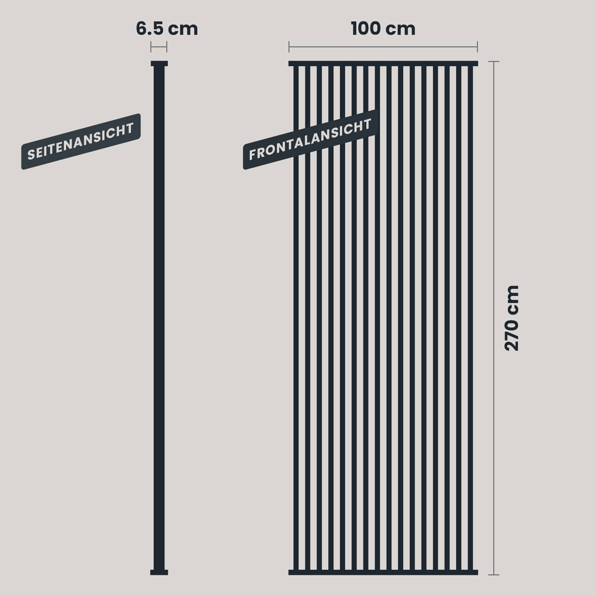 Jede Lamelle ist 270 cm lang und kann bei Bedarf gekürzt werden. Gefertigt aus MDF mit strapazierfähiger Dekorfolie auf PEFC-zertifizierter Holzbasis bietet das System eine langlebige, pflegeleichte und UV-beständige Oberfläche. Dank der modularen Bauweise lässt sich der Raumtrenner flexibel erweitern und an unterschiedliche Raumgrößen anpassen.