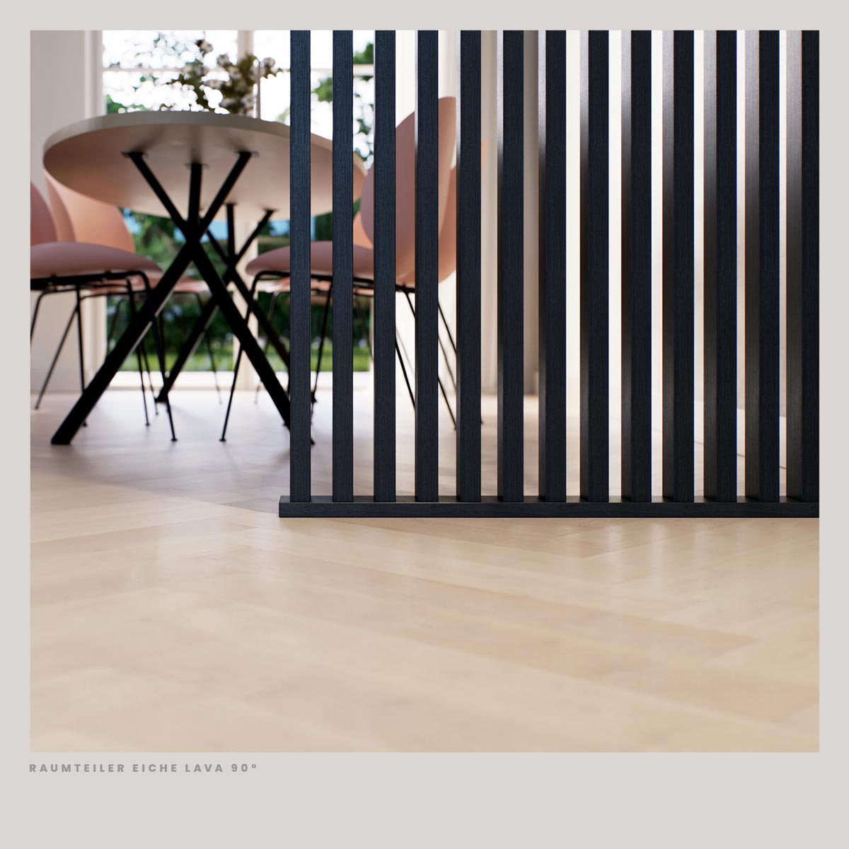 Die vertikal eingesetzten Lamellen gliedern Flächen sichtbar, ohne sie komplett zu trennen. Tageslicht bleibt erhalten, während gleichzeitig ein dezenter Sichtschutz entsteht. Das Dekor in Eiche Lava verleiht dem Raum eine markante, moderne Wirkung und lässt sich in unterschiedliche Einrichtungskonzepte integrieren.