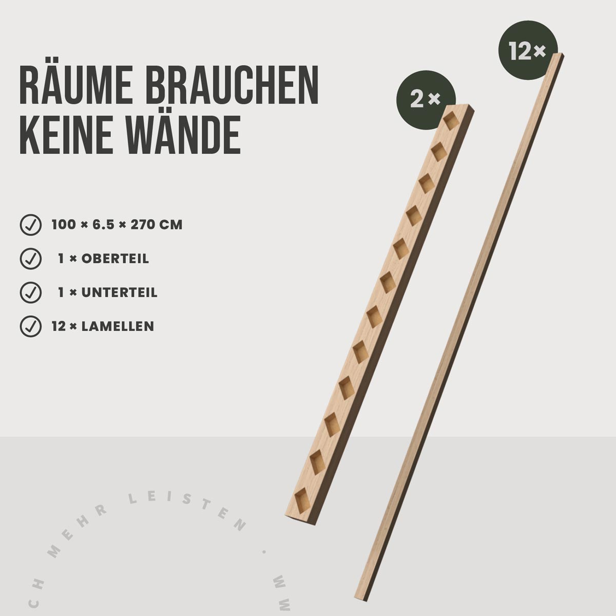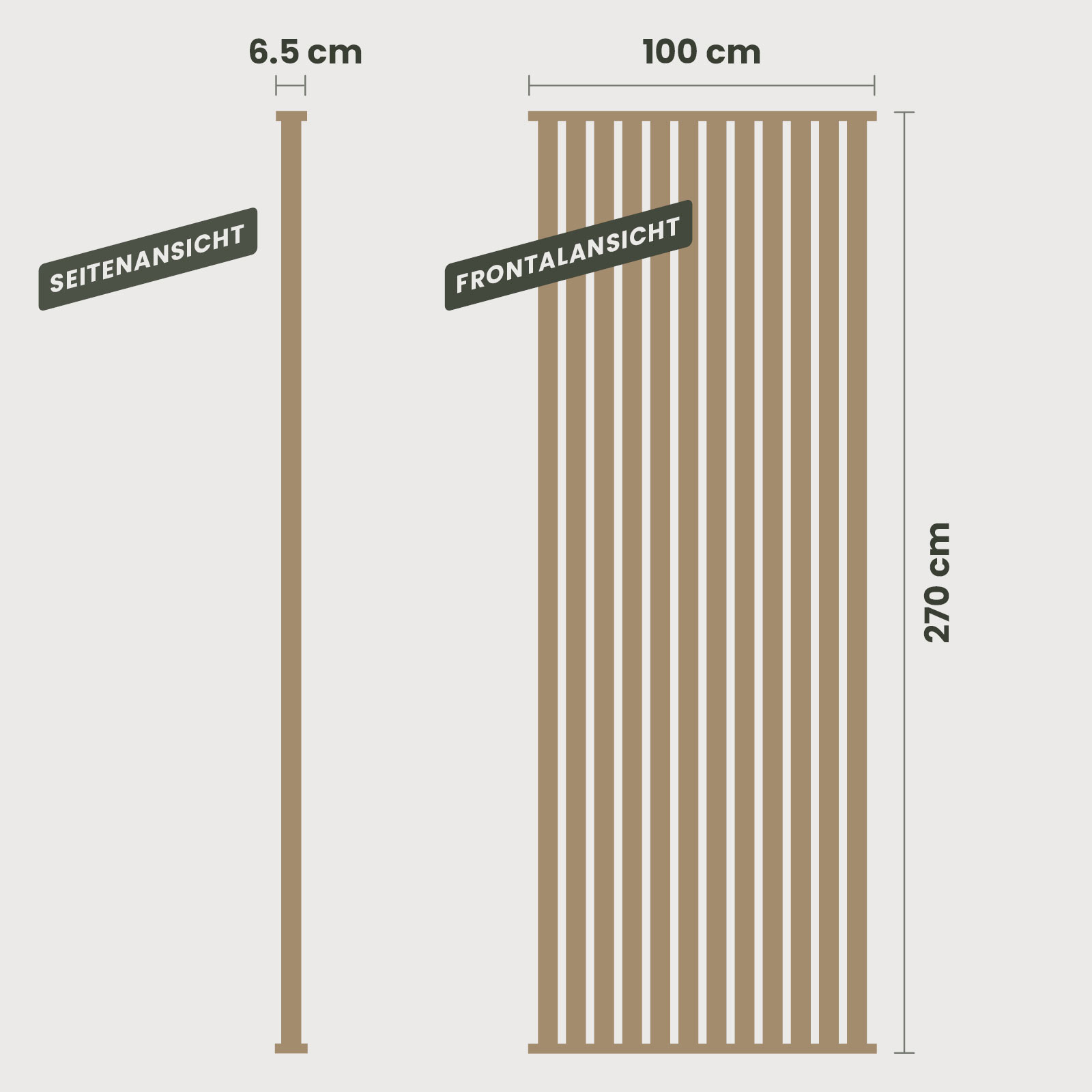 Die einzelnen Lamellen haben eine Länge von 270 cm und können bei Bedarf gekürzt werden. Gefertigt aus MDF mit strapazierfähiger Dekorfolie und PEFC-zertifizierter Holzbasis bietet das System eine langlebige, pflegeleichte und UV-beständige Oberfläche. Dank der modularen Bauweise lässt sich der Raumtrenner bei Bedarf erweitern oder anpassen.