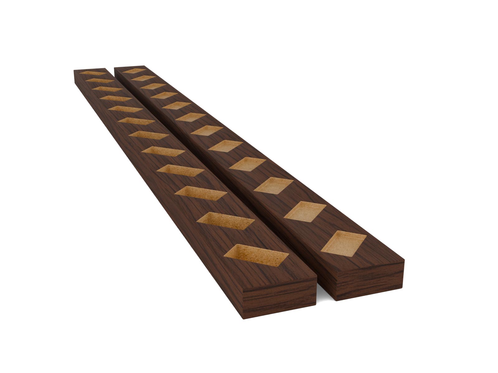 Die Ober- und Unterprofile in 45°-Ausführung in Walnuss bilden die konstruktive Grundlage für einen Raumtrenner mit versetzter Lamellenanordnung. Gefertigt aus MDF mit strapazierfähiger Dekorfolie in Walnussoptik, sorgen sie für eine präzise Führung und einen sauberen Abschluss von Boden bis Decke.