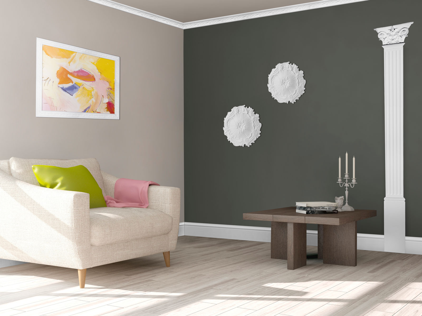 Dieses Wandprofil besteht aus leichtem, stabilem Styropor (Polystyrol) und ist für den Einsatz im Innenbereich gedacht. Mit seinen kompakten Maßen 150x230x60mm eignet es sich gut für Bereiche mit wenig Platz, in denen die Wand optisch unterteilt werden soll.