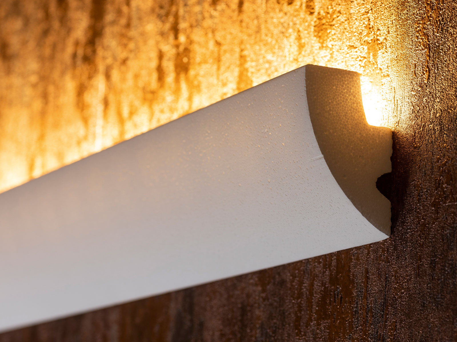 Die Lichtleiste Anja aus Styropor eignet sich für die indirekte LED-Beleuchtung im Innenbereich. Sie wird als Wand- oder Deckenabschluss eingesetzt und erzeugt ein gleichmäßiges Lichtbild. Das Profil ist weiß und überstreichbar und lässt sich vielseitig einsetzen.